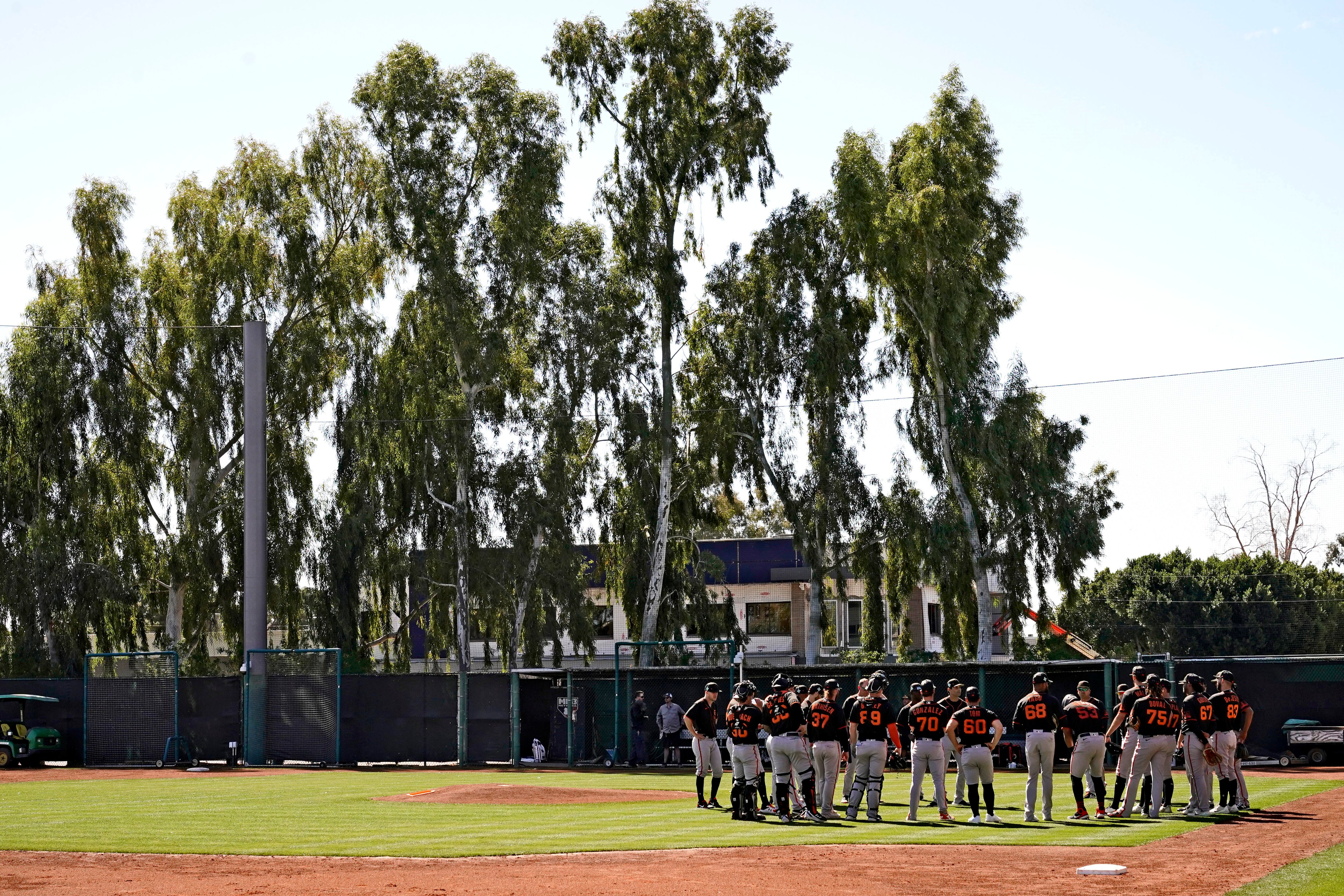 Los Gigantes de San Francisco se reúnen en el terreno durante un entrenamiento de pretemporada el 15 de marzo, en Scottsdale, Arizona (AP Foto/Matt York) (Matt York/AP)