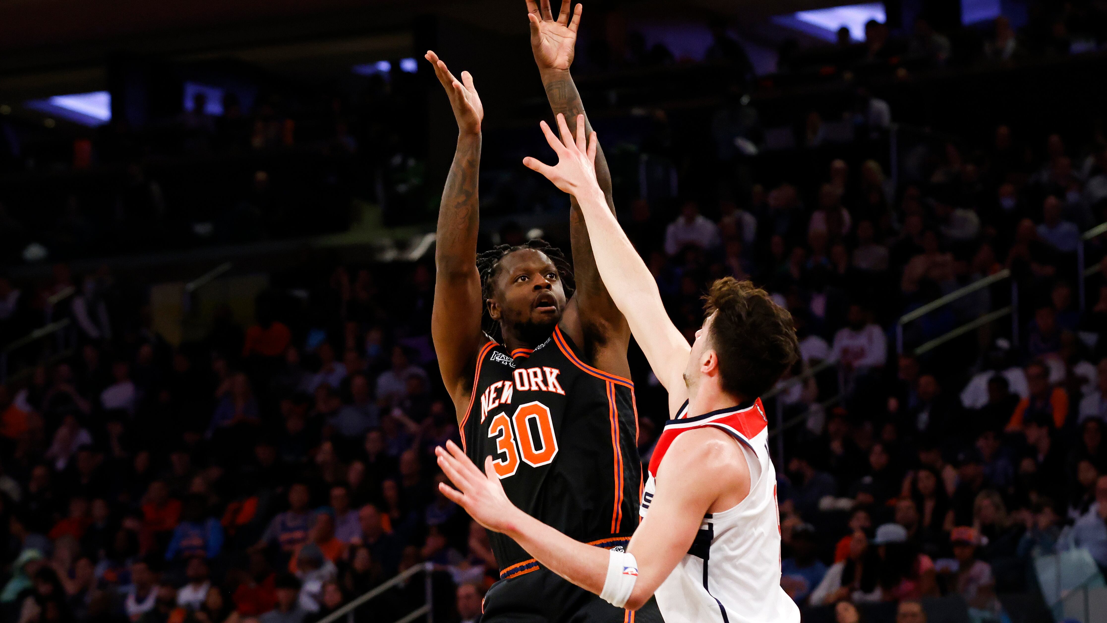 Julius Randle, de los Knicks de Nueva York, dispara frente a Deni Avidja, de los Wizards de Washington, en el encuentro del viernes 18 de marzo de 2022 (AP Foto/Jason DeCrow) (Jason DeCrow/AP)