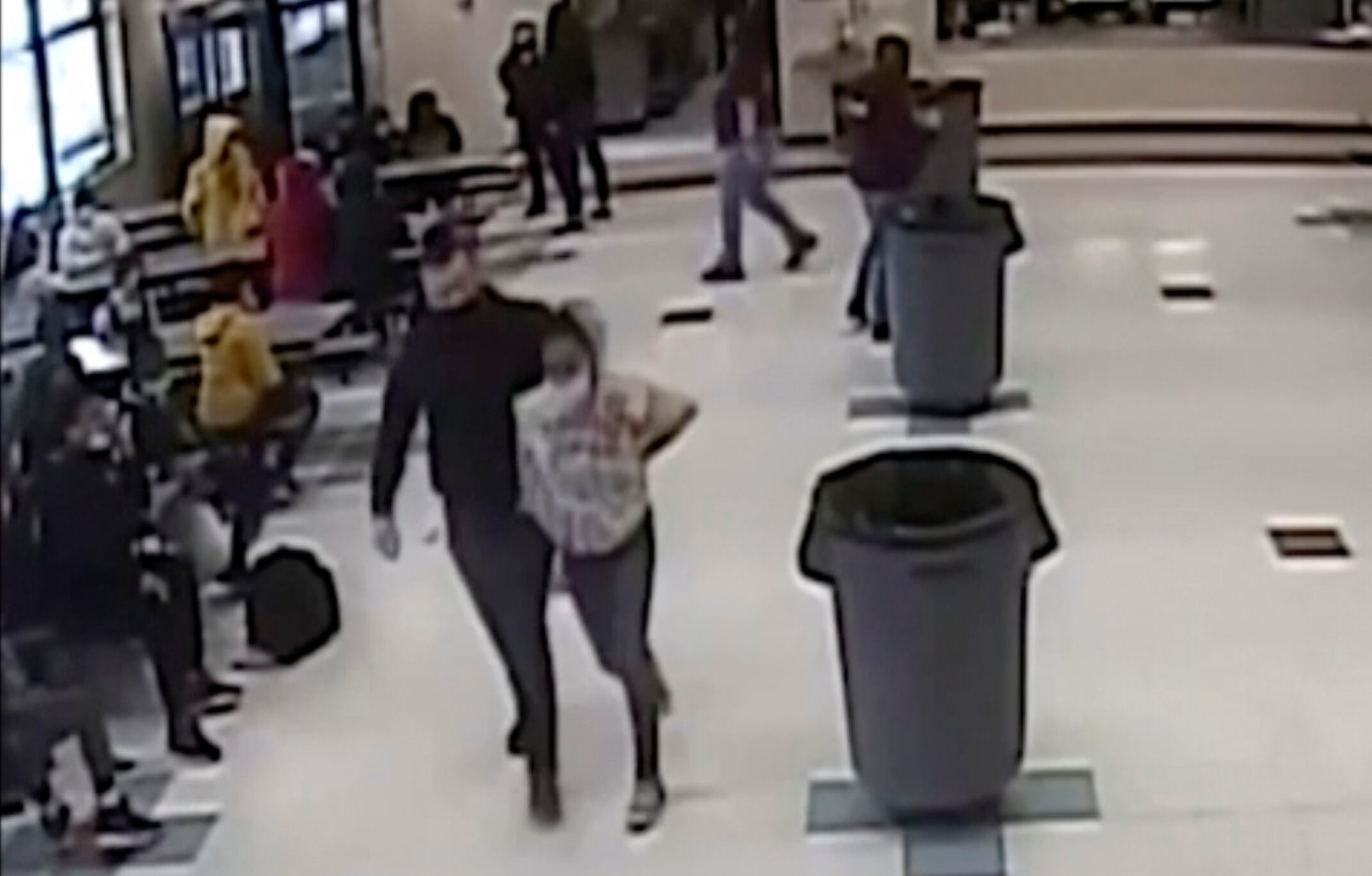 Luego, Guetschow, que trabajaba como guardia de seguridad en la escuela, presiona la cabeza de la niña contra el piso y coloca su rodilla en su cuello durante medio minuto aproximadamente, antes de esposarla y sacarla de la cafetería.