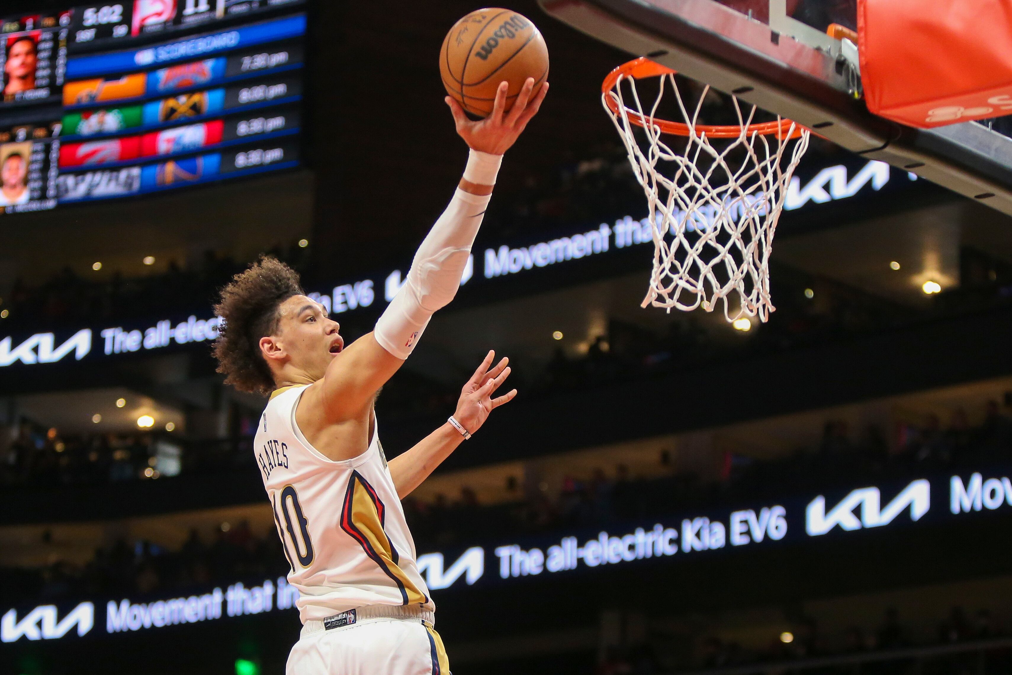 Jaxson Hayes encesta por los Pelicans de Nueva Orleans en un encuentro ante los Hawks de Atlanta, el domingo 20 de marzo de 2022, en Atlanta. (AP Foto/Brett Davis) (Brett Davis/AP)