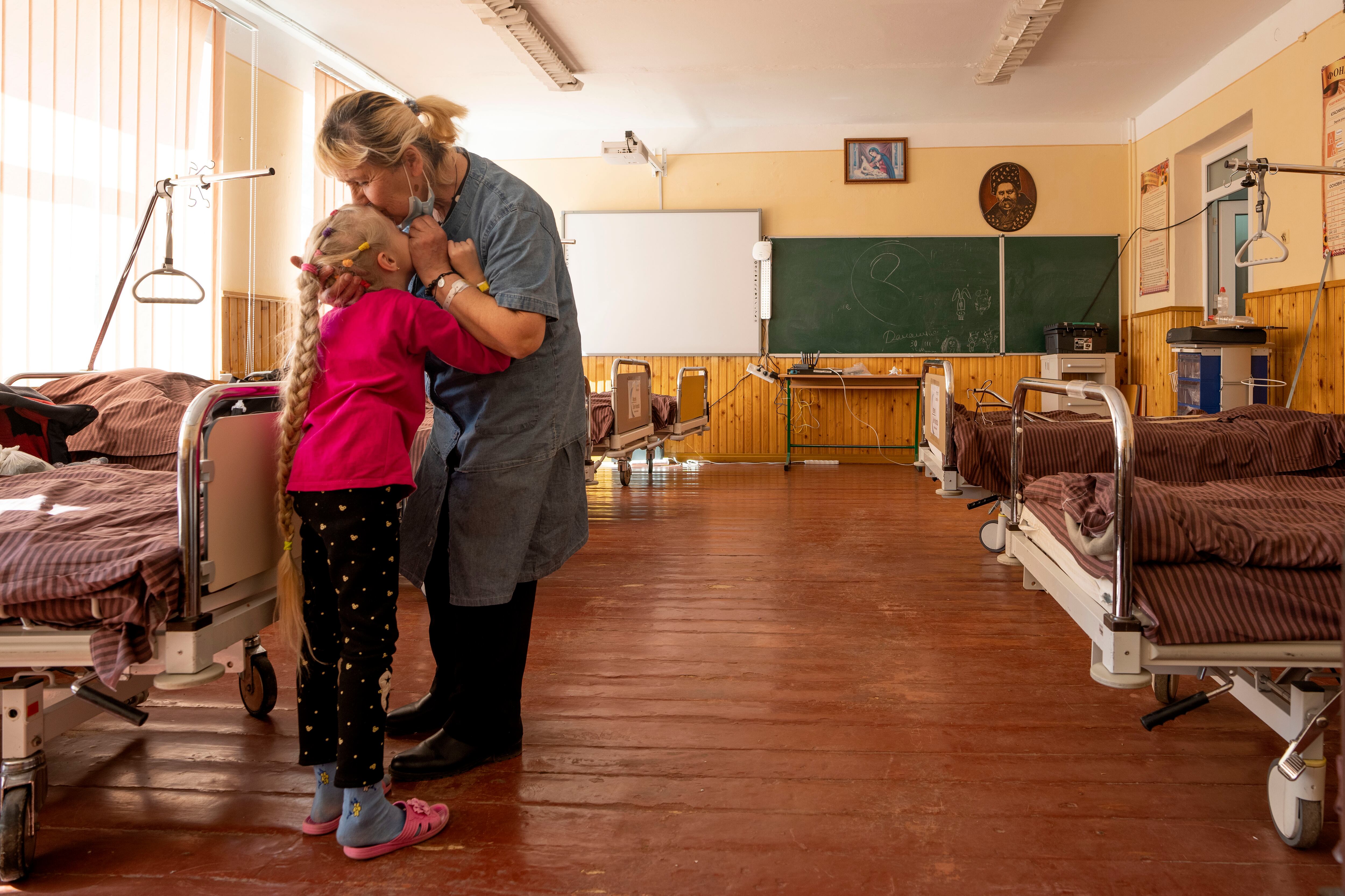 Nadia besa a su nieta de 10 años, Zlata Moiseinko, quien padece una afección cardíaca crónica, mientras recibe tratamiento en una escuela convertida en hospital de campaña en Mostyska, en el oeste de Ucrania, el jueves 24 de marzo de 2022. (Foto AP/N (Nariman El-Mofty/AP)