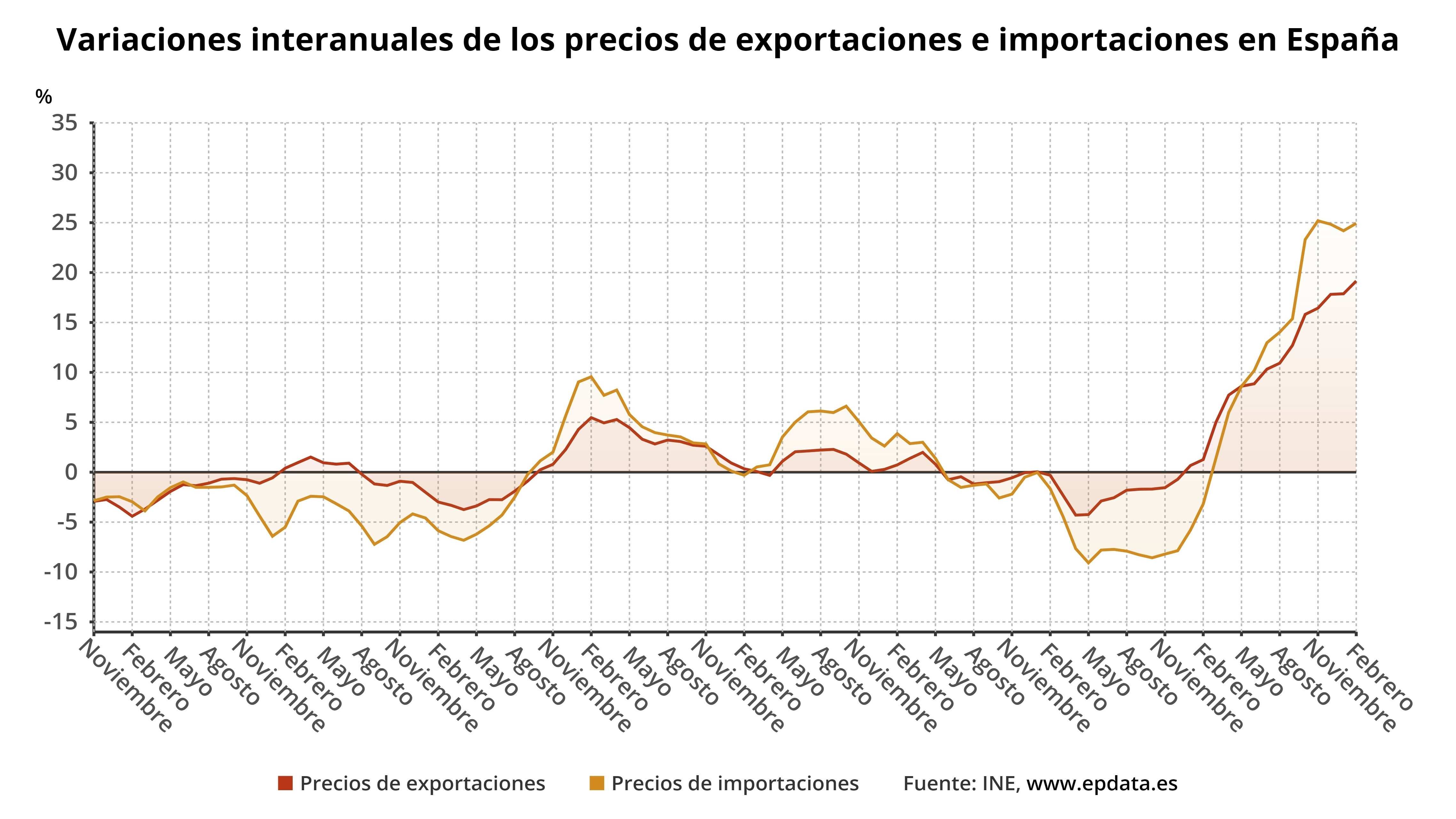 Con las cifras de febrero de 2022, los precios de las exportaciones encadenan 14 meses consecutivos de avances interanuales, mientras que los de las importaciones suman 12 meses de tasas positivas.