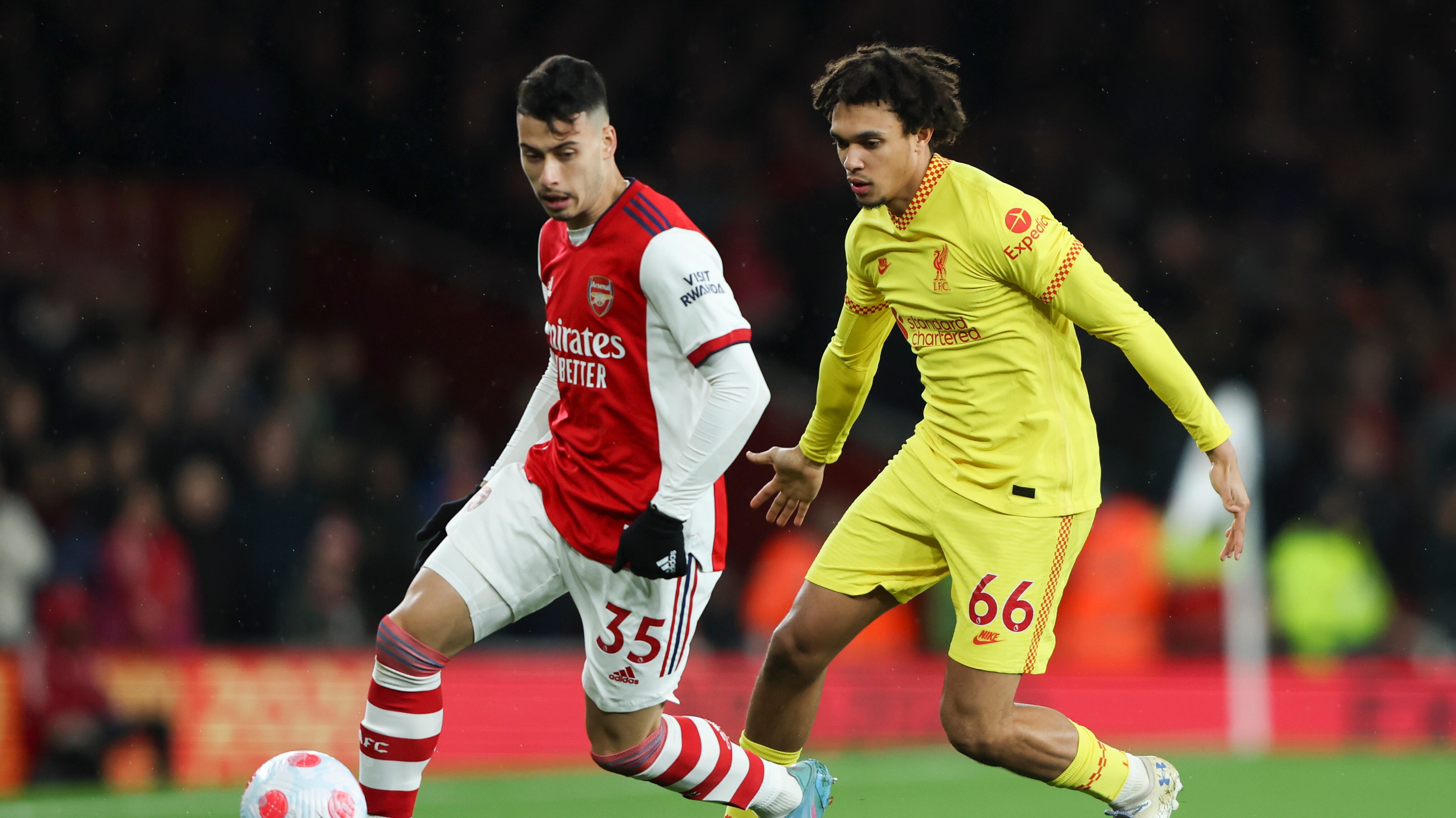 Gabriel Martinelli, izquierda, del Arsenal, protege el balón del lateral Trent Alexander-Arnold, del Liverpool, en partido por la Liga Premier en el Estadio Emirates de Londres, el miércoles 16 de marzo de 2022. (AP Foto/Ian Walton) (Ian Walton/AP)