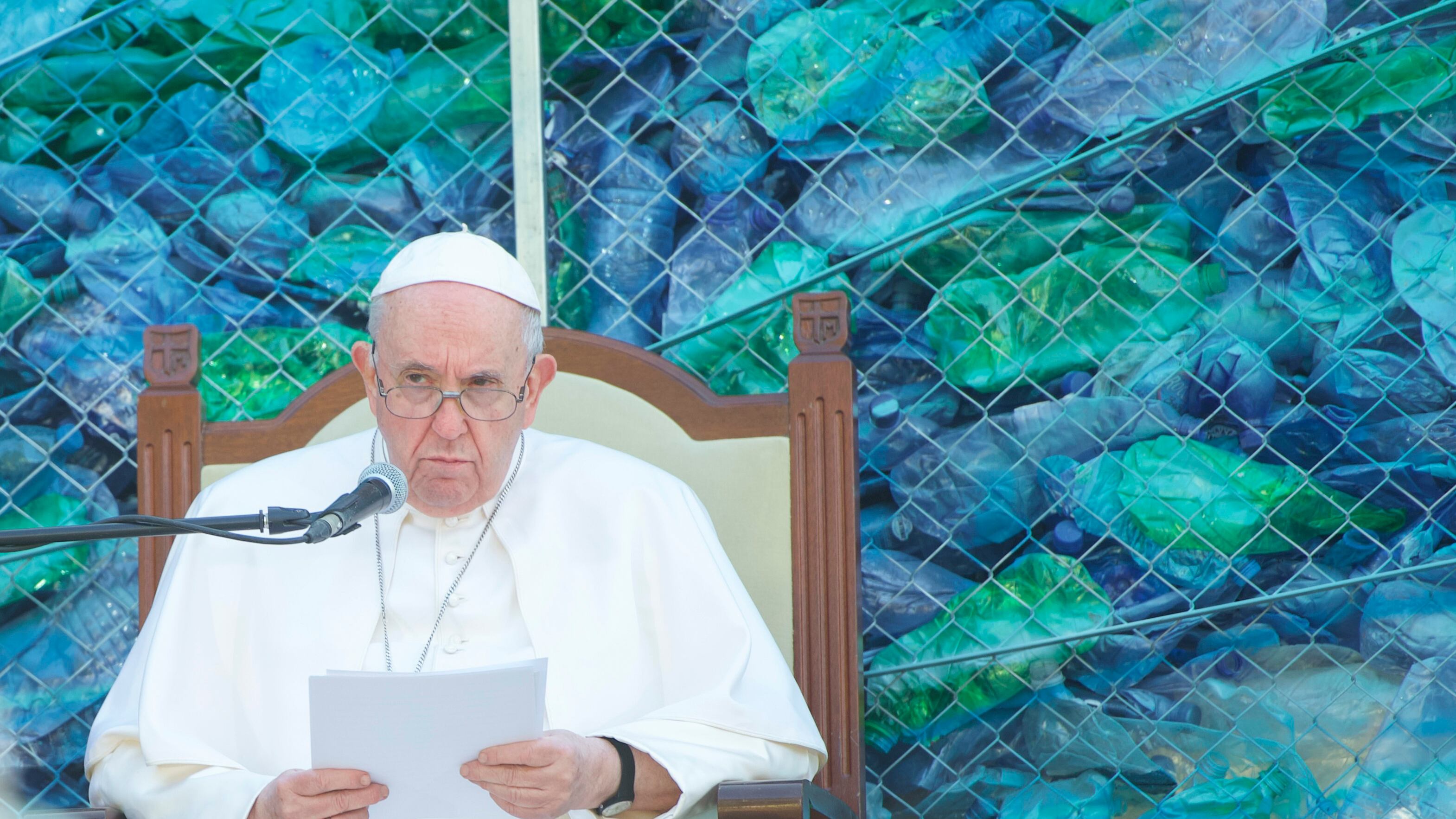 ARCHIVO - El papa Francisco lee su discurso en el centro para migrantes "Laboratorio por la Paz Juan XXIII" en Hal Far, Malta, 3 de abril de 2022. La oficina del presidente de Líbano dice que Francisco visitará el país en junio. (AP Foto/Rene Rossignau (Rene Rossignaud/AP)