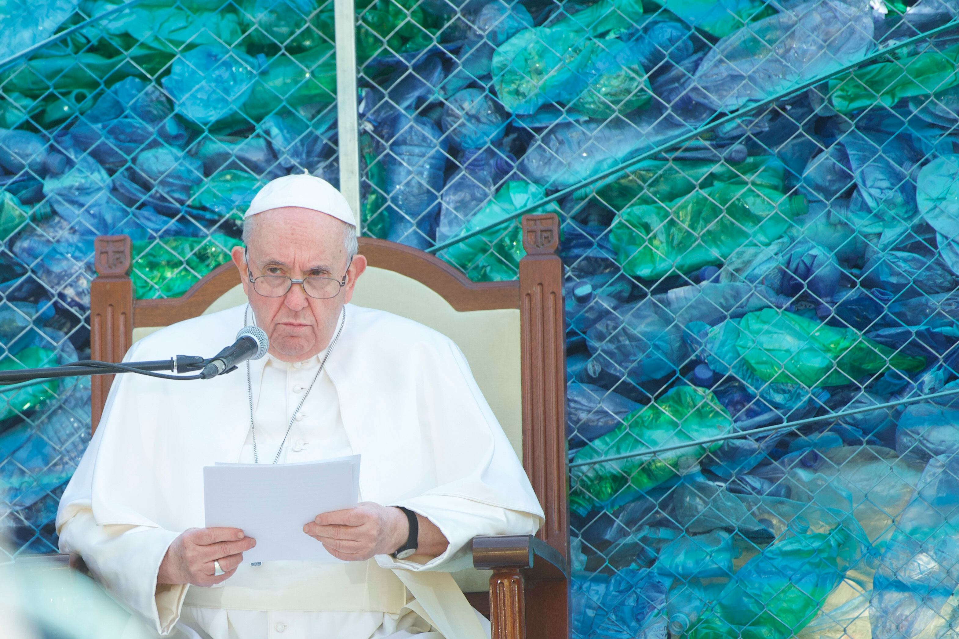 ARCHIVO - El papa Francisco lee su discurso en el centro para migrantes "Laboratorio por la Paz Juan XXIII" en Hal Far, Malta, 3 de abril de 2022. La oficina del presidente de Líbano dice que Francisco visitará el país en junio. (AP Foto/Rene Rossignau (Rene Rossignaud/AP)
