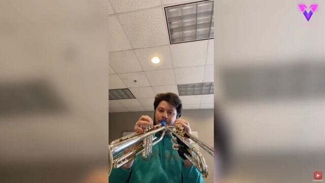 Jesse lleva 13 años tocando la trompeta y hace poco empezó a imprimir en 3D boquillas personalizadas, entre ellas ésta que puede acoplarse a dos trompetas simultáneamente. Con esta boquilla experimental, Jesse fidea y hace algunos solos en dos trompas al mismo tiempo.