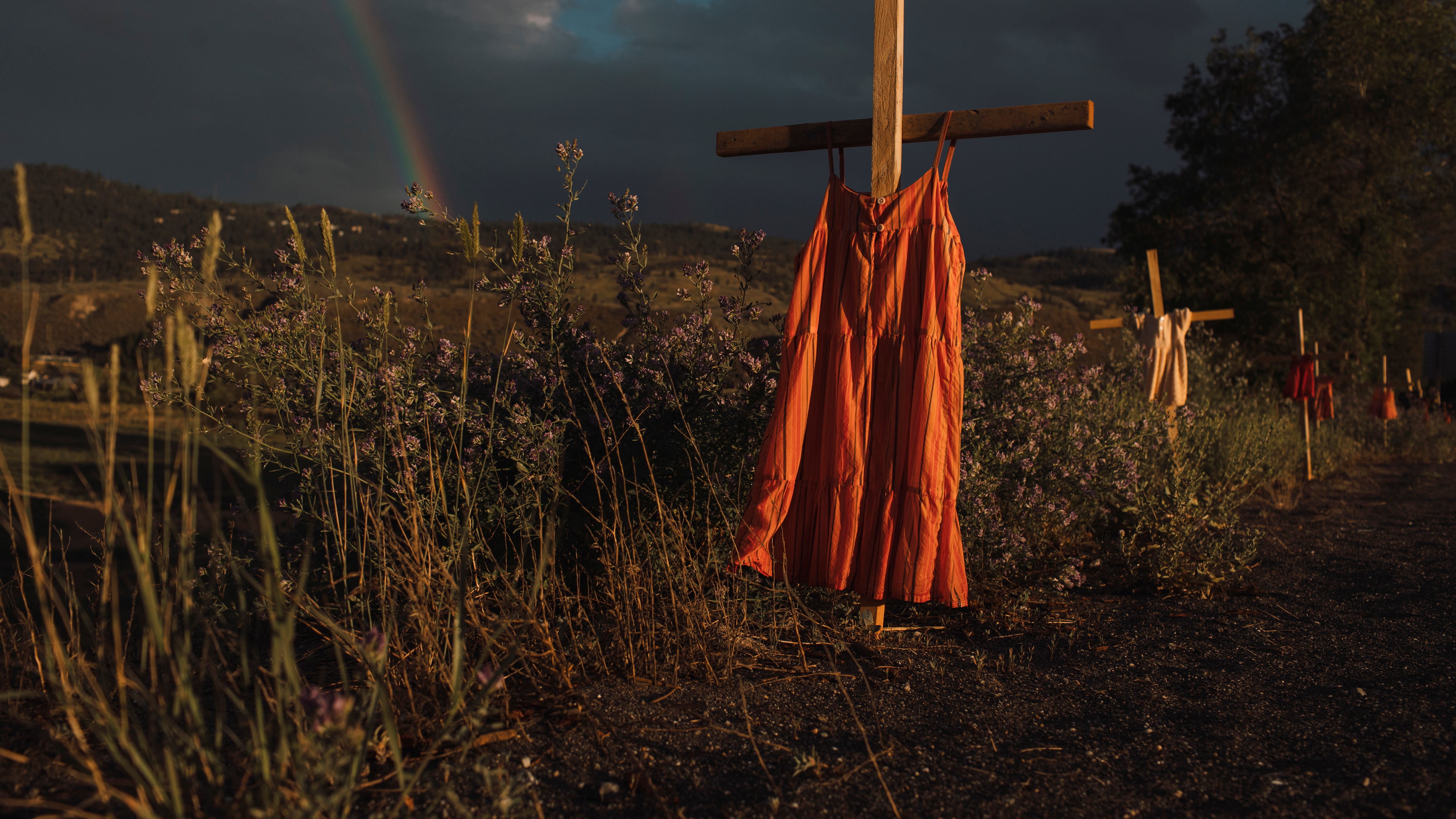 “Así que empezamos a tener, supongo, una personificación de algunos de los niños que fueron a esas escuelas y no regresaron», dijo Bracken en declaraciones distribuidas por los organizadores. “También estaban estas pequeñas cruces junto a la carretera. Y supe de inmediato que quería fotografiar la línea de estas cruces con la ropa de esos pequeños colgando de ellas para recordar y honrar a esos niños y hacerlos visibles de una forma en la que no lo habían sido en mucho tiempo».