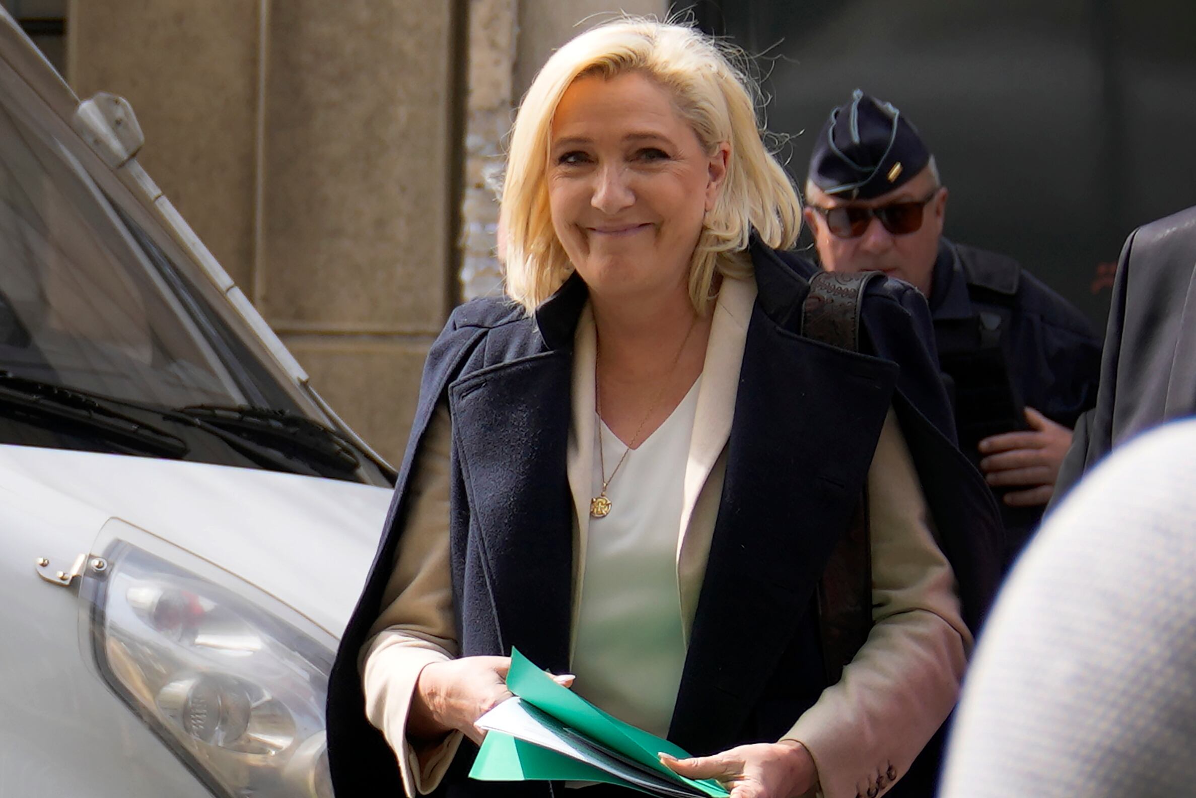 La candidata presidencial francesa de extrema derecha, Marine Le Pen, sale de la sede de su campaña en París, el lunes 11 de abril de 2022. (AP Foto/Francois Mori) (Francois Mori/AP)