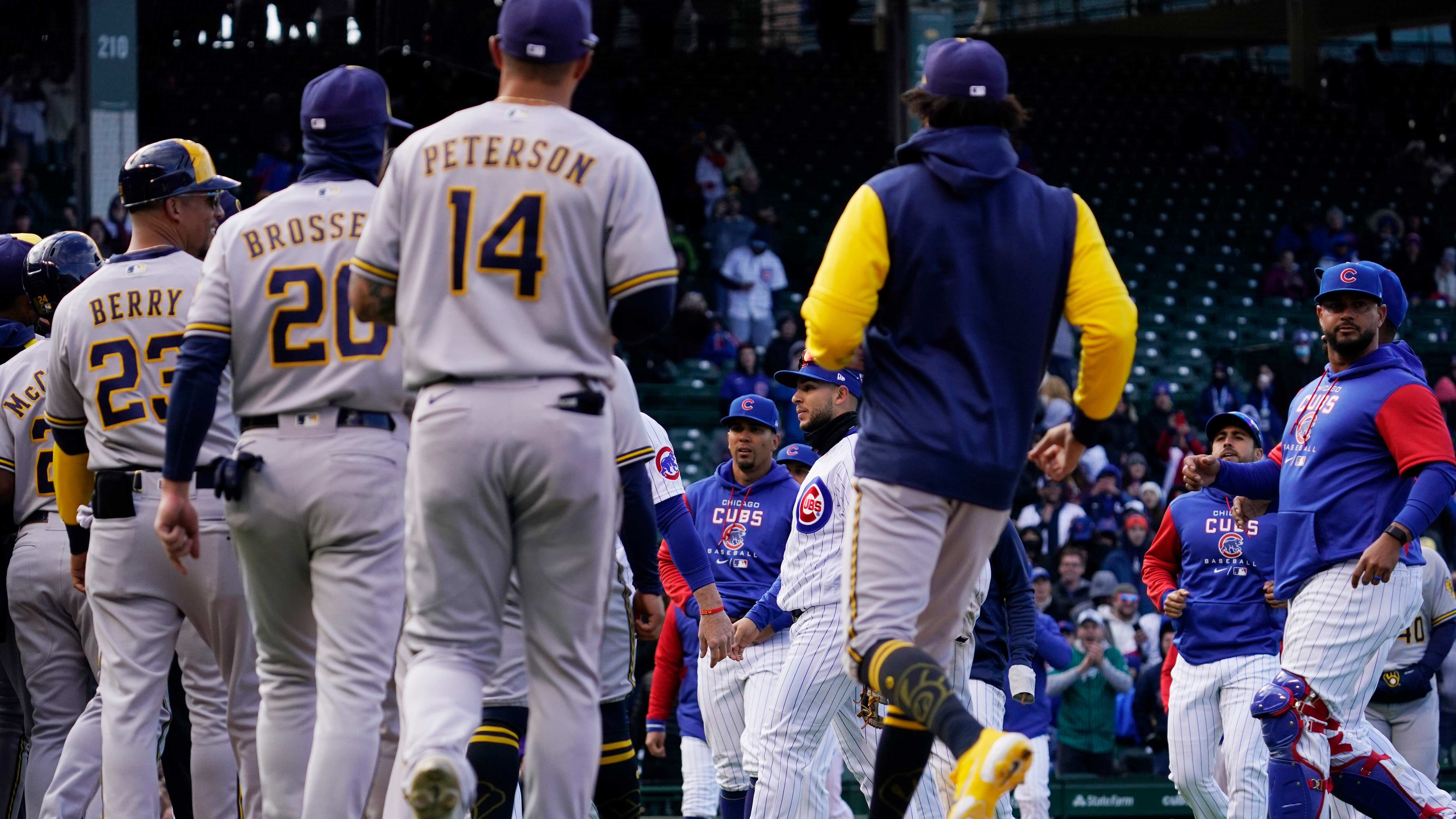 Los Cerveceros de Milwaukee y los Cachorros de Chicago vaciaron sus bancas después de que Andrew McCutchen fuera golpeado por un lanzamiento del relevista Keegan Thompson en la octava entrada del juego de béisbol en Chicago, el sábado 9 de abril de 202 (Nam Y. Huh/AP)