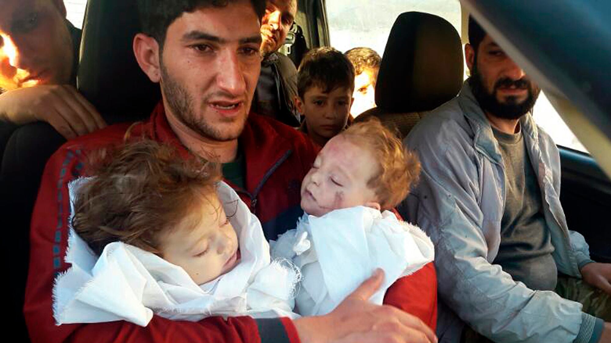 Siria. Abdel Hameed Alyousef, de 29 años, sostiene los cuerpos de sus bebés gemelos, que murieron durante un presunto ataque con armas químicas, en Khan Sheikhoun, en la provincia norteña de Idlib, Siria, el 4 de abril de 2017. (STR/AP)