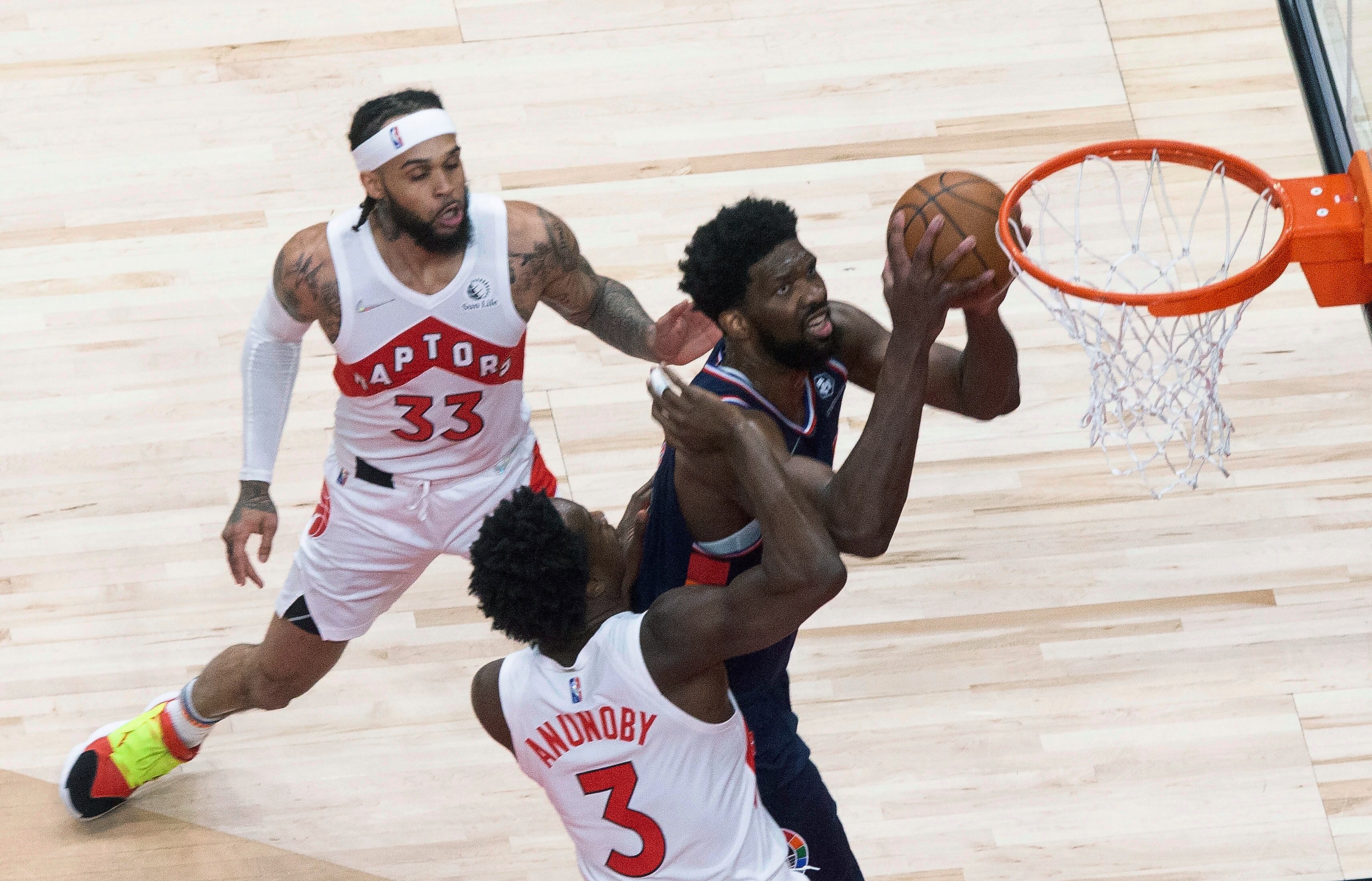TORONTO (AP) — Joel Embiid encestó un triple a 0,8 segundos del final del alargue y los 76ers de Filadelfia ganaron por 104-101 a los Raptors de Toronto el miércoles, con lo cual tomaron ventaja de 3-0 en la serie de primera ronda de la postemporada.