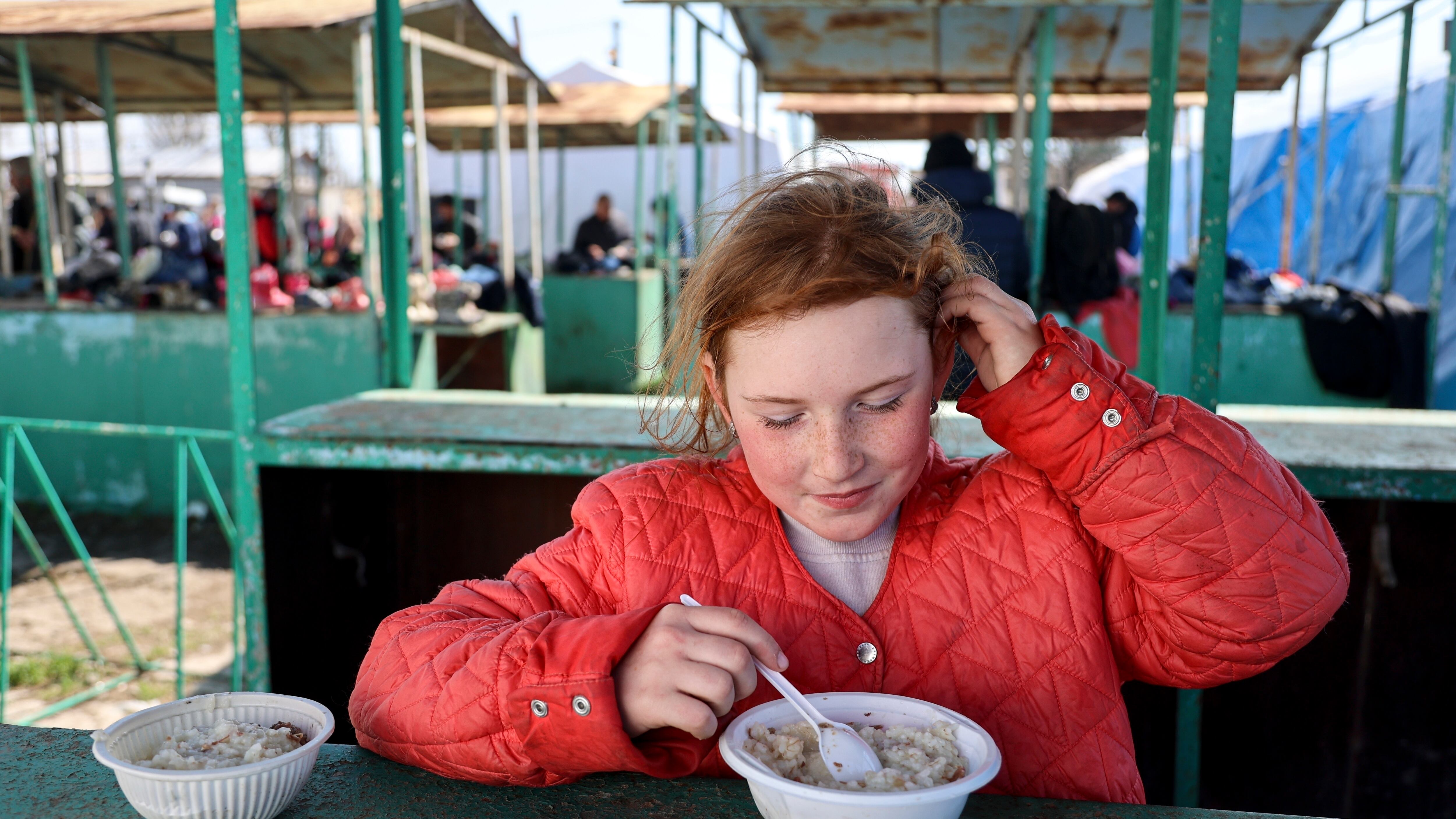 Una civil toma un plato de comida caliente distribuida por el Ministerio de Situaciones de Emergencia de la República Popular de Donetsk, en una zona controlada por las fuerzas separatistas prorrusas, en la localidad de Bezimenne, en el este de Ucrania, (Alexei Alexandrov/AP)