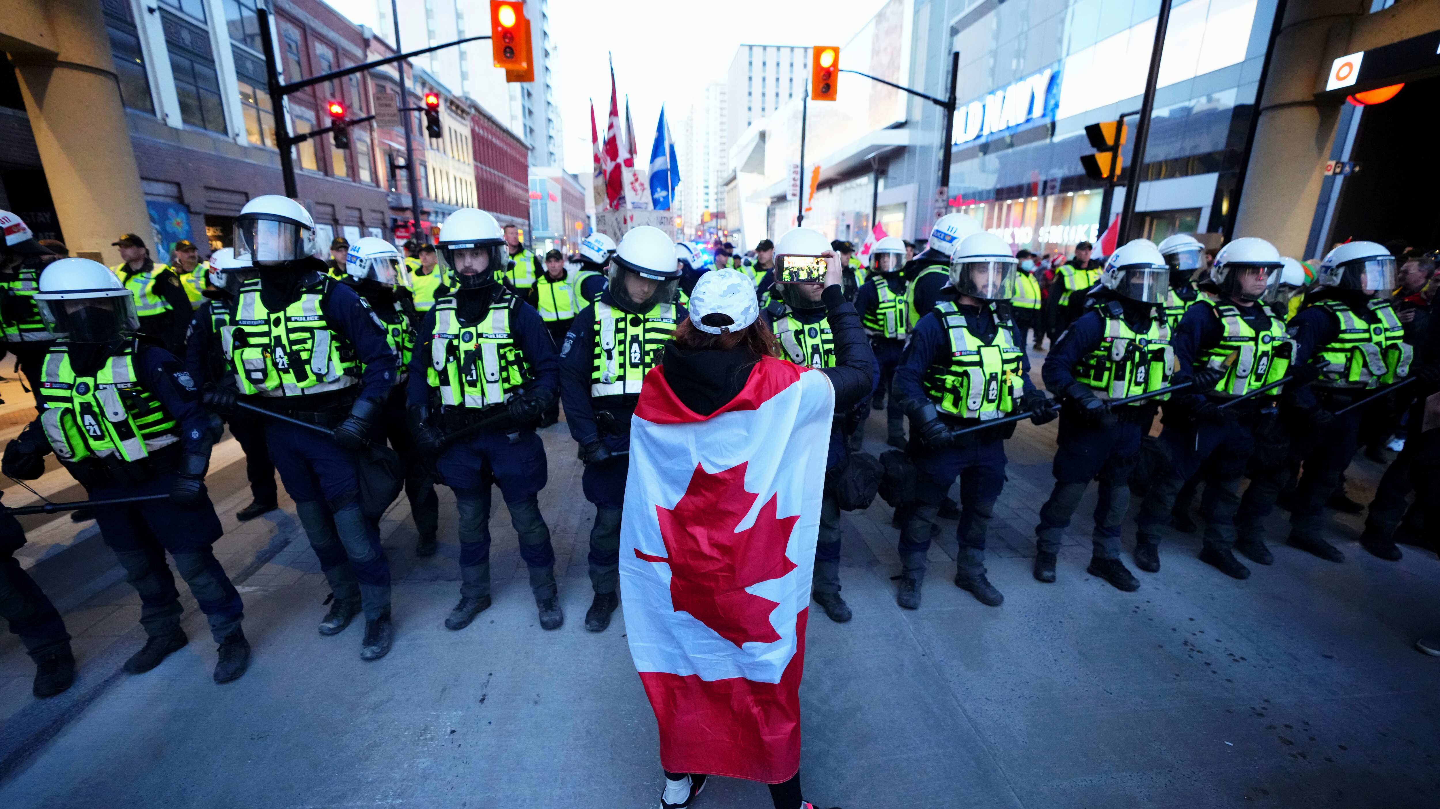 Jeff Leiper, concejal municipal de Ottawa, reportó haber visto a la policía destrozar la ventanilla de un camión para tomar control del vehículo. Se vio a agentes efectuar arrestos en la calle.