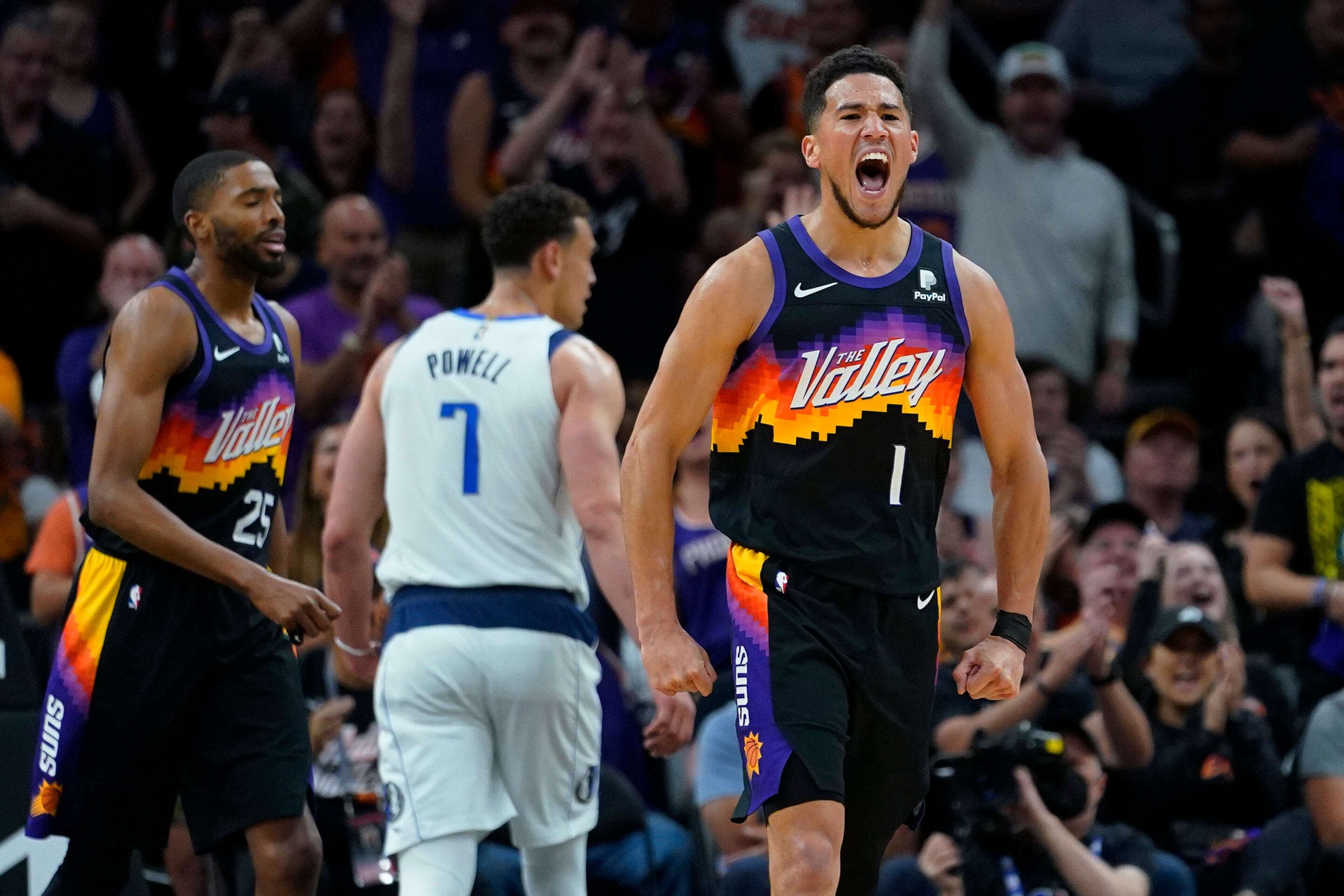 El jugador de los Suns de Phoenix Devin Booker (1) celebra una canasta contra los Mavericks de Dallas, en el primer juego de su serie de playoffs de la Conferencia Oeste de la NBA, el lunes 2 de mayo de 2022 en Phoenix. (AP Foto/Matt York) (Matt York/AP)