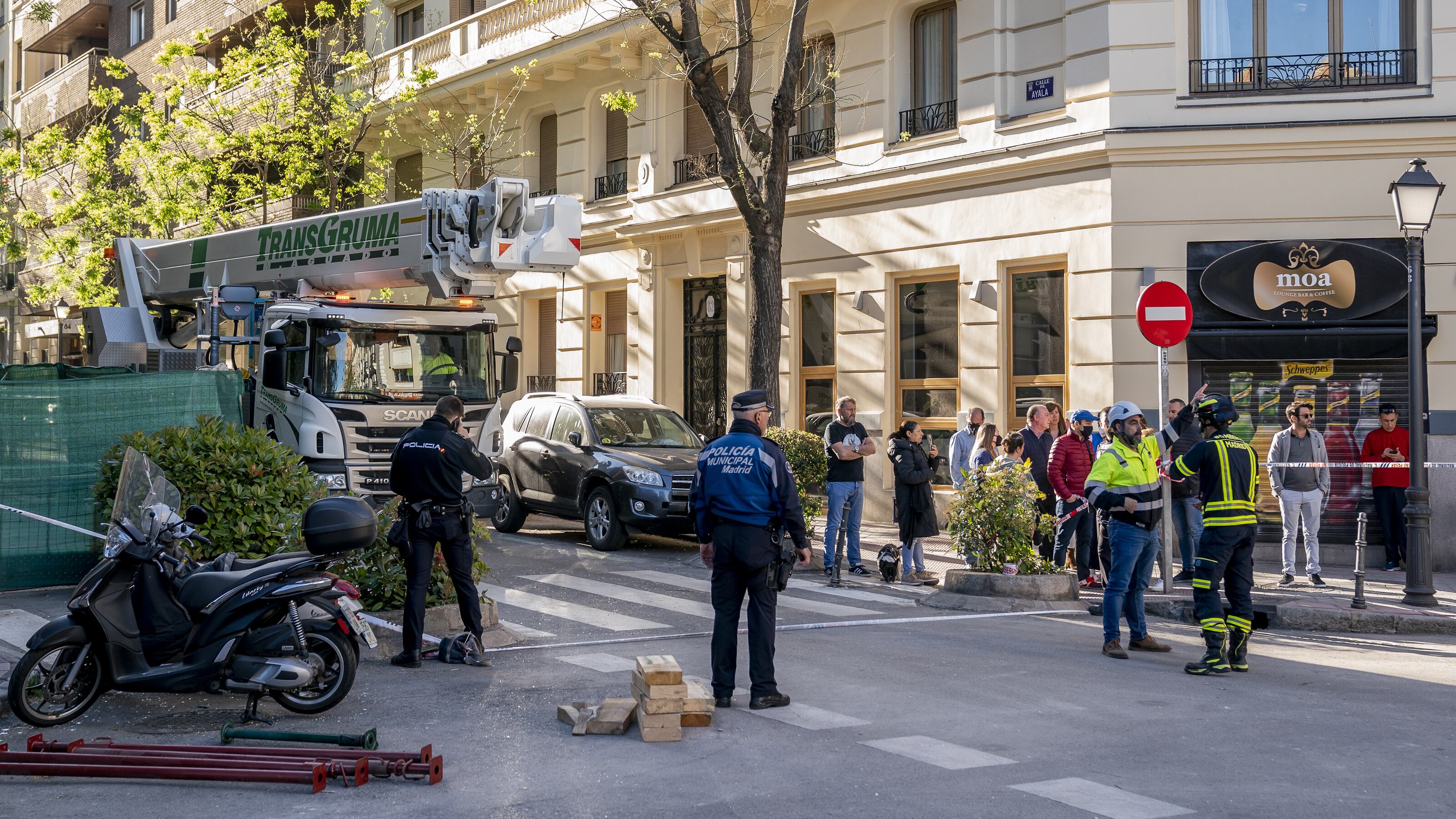 Bomberos del Ayuntamiento de Madrid han evaluado este sábado el derribo del edificio afectado por la explosión en el distrito de Salamanca en donde han consolidado los huecos de la fachada afectados y han apuntalado las estructuras del edificio.