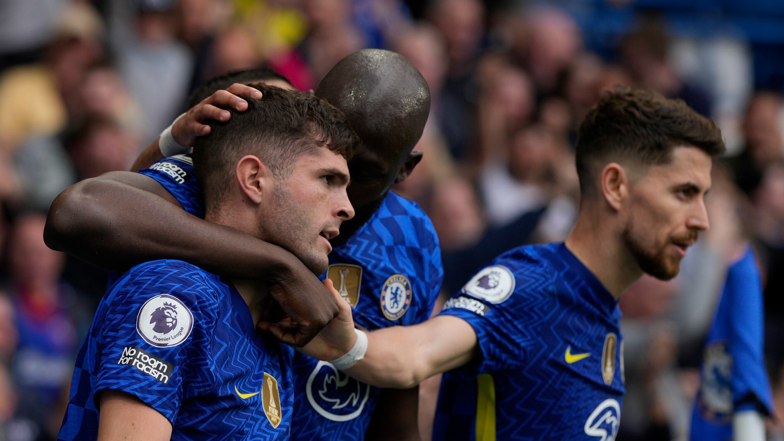Christian Pulisic, a la izquierda, celebra con sus compañeros del Chelsea después de anotar en el partido de la Premier ante el West Ham United, el domingo 24 de abril de 2022, en Londres. (AP Foto/Alastair Grant) (Alastair Grant/AP)