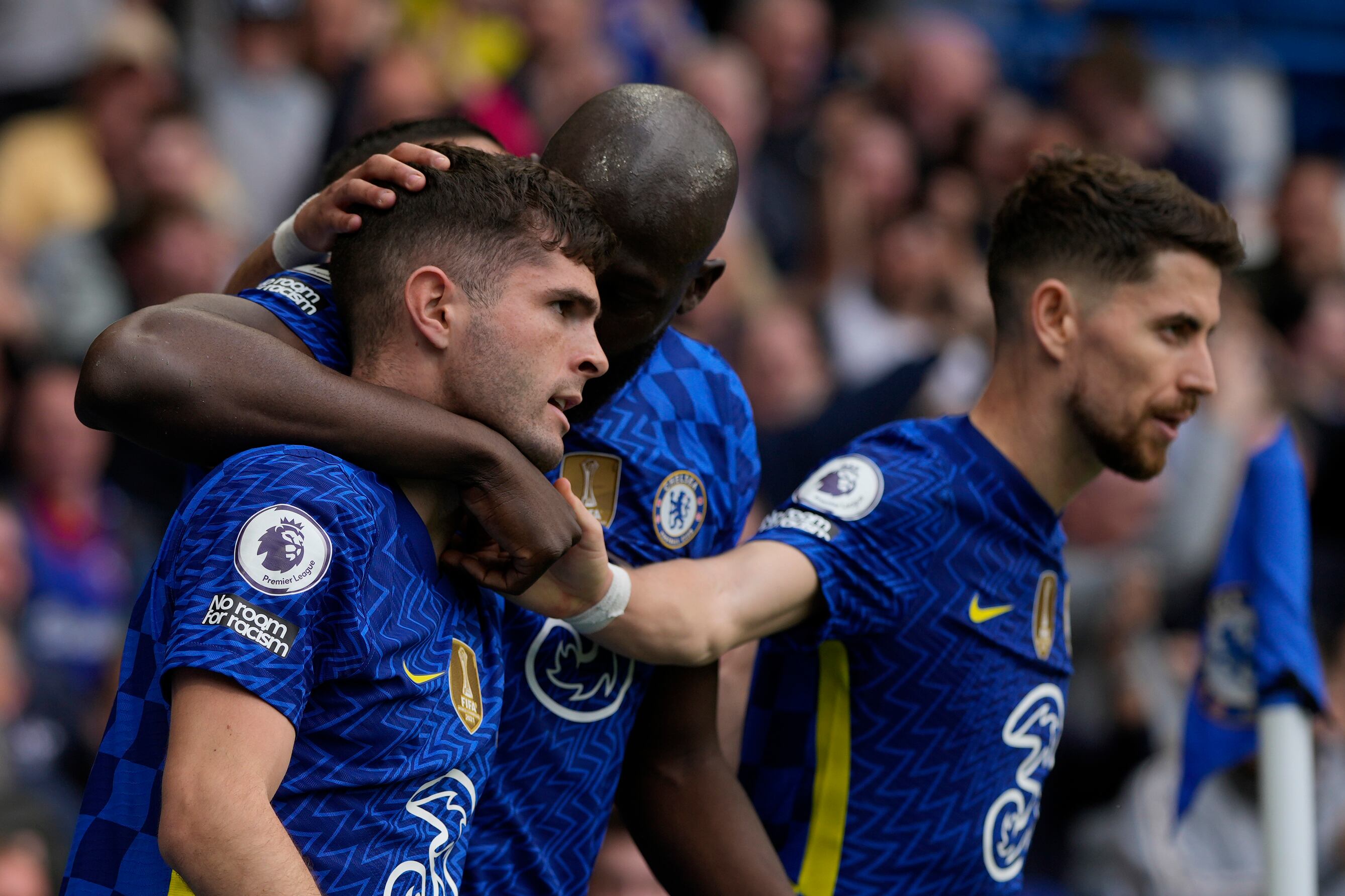 Christian Pulisic, a la izquierda, celebra con sus compañeros del Chelsea después de anotar en el partido de la Premier ante el West Ham United, el domingo 24 de abril de 2022, en Londres. (AP Foto/Alastair Grant) (Alastair Grant/AP)
