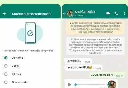 Actualmente, la aplicación de mensajería permite a los usuarios crear conversaciones temporales cuyos chats se eliminan pasado un tiempo determinado independientemente de si el receptor los ha leído o no, ya sea de 24 horas, 7 días o 90 días.