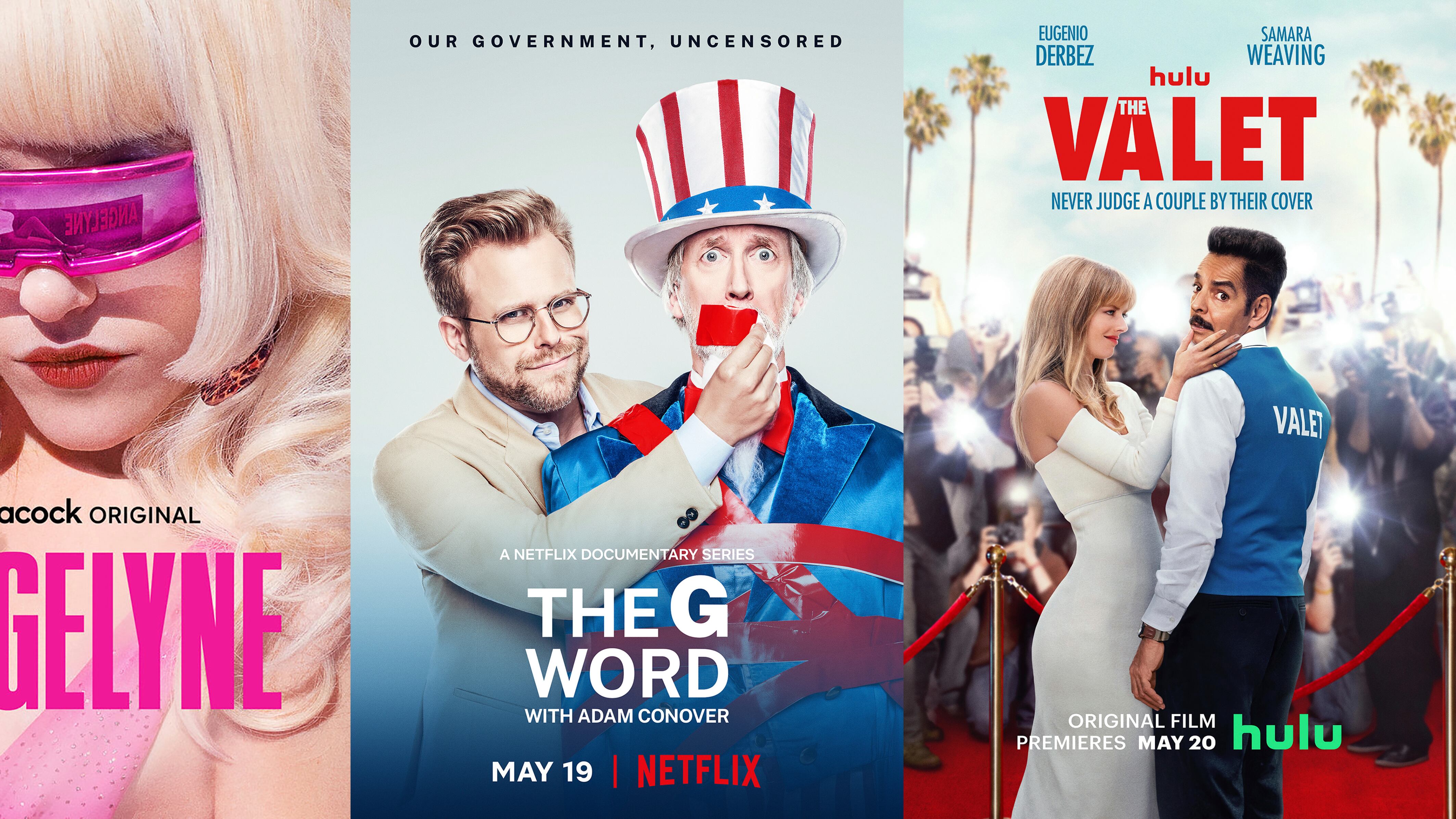 En esta combinación de fotos, el arte promocional de la serie limitada "Angelyne", que se estrena el 19 de mayo en Peacock; "The G Word With Adam Conover", que debuta el 19 de mayo en on Netflix, y la comedia romántica "The Valet", disponible en Hulu a (AP)