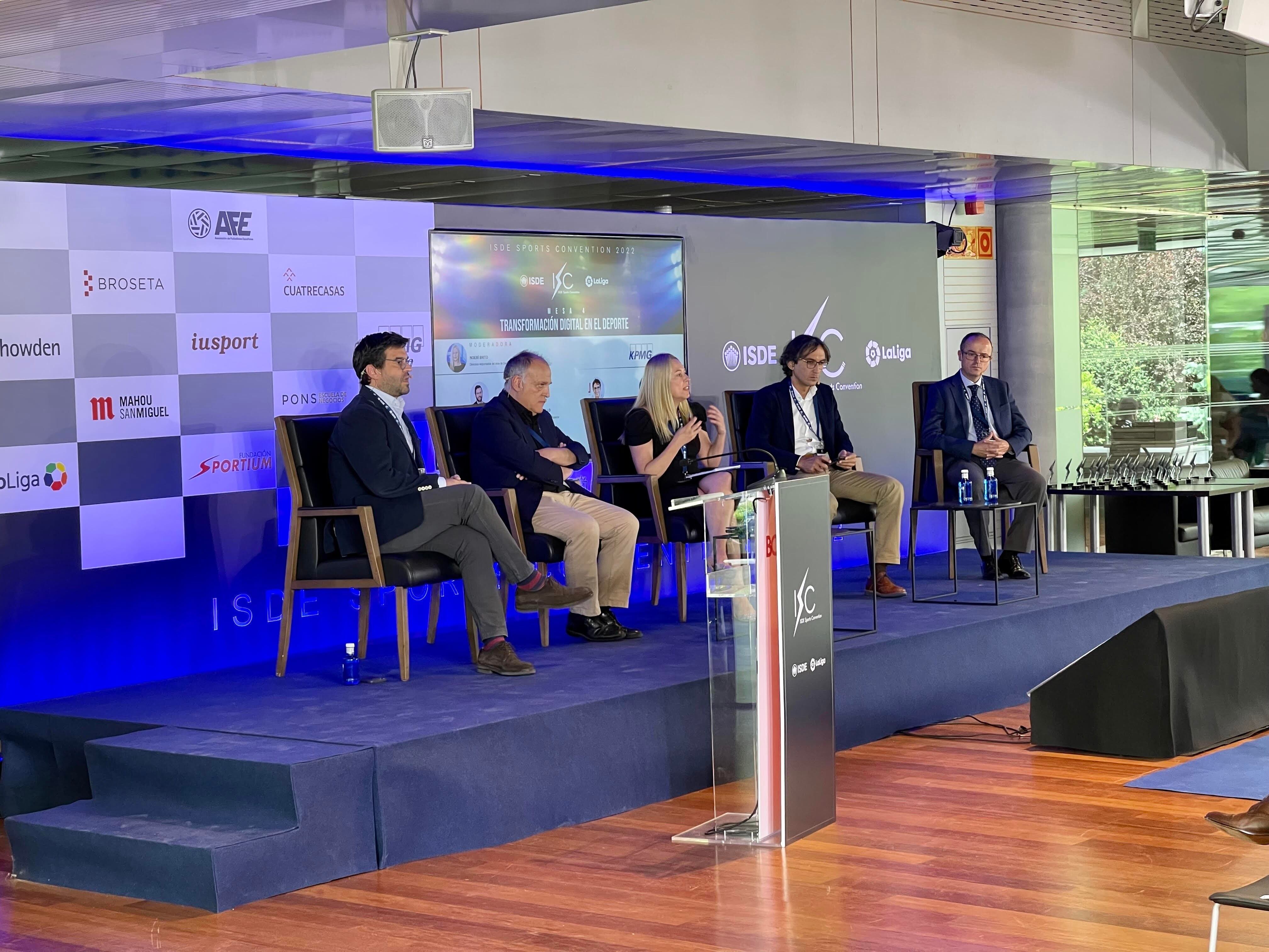 El presidente de LaLiga habló en una mesa redonda del ISDE Sports Convention 2020, organizado por ISDE, LaLiga y el Ayuntamiento de Madrid, con el tema ‘Transformación Digital en el Deporte’. Moderados por la Directora Responsable de las Áreas Legales IT & IP (Digital Law) de KPMG, Noemí Brito, participaron también el secretario general del CSD, Pablo Castillo, el CEO de IOT y Big Data de Telefónica Tech, Gonzalo Martín-Villa y el managing director de ISDI, Rodrigo Miranda.