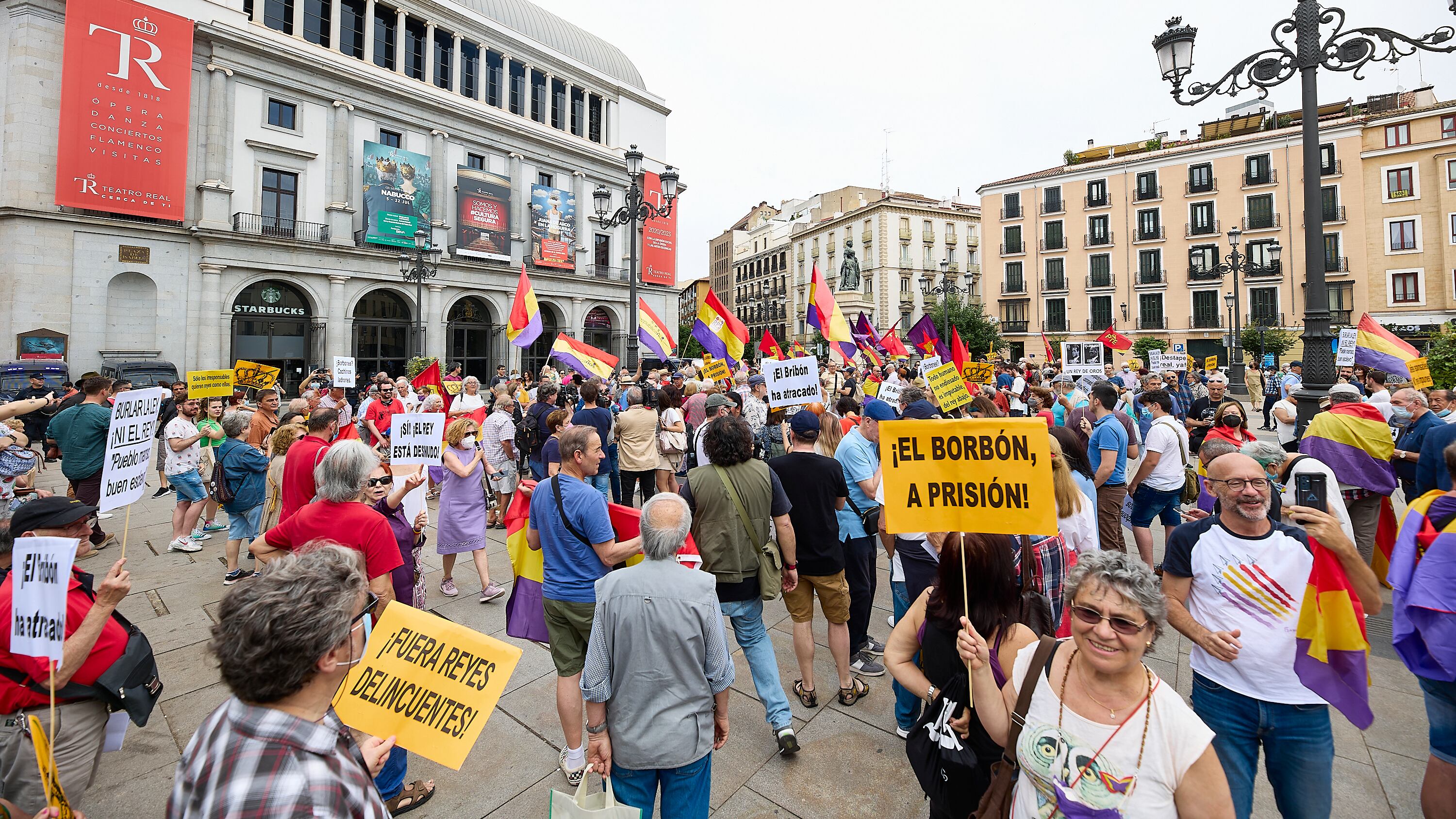 Varias personas se manifiestan con banderas de la República de España, durante una concentración contra la vuelta del Rey emérito a España, en la Plaza de Ópera, a 22 de mayo de 2022, en Madrid (España). Una treintena de organizaciones entre las qu Jesús Hellín - Europa Press (Jesus Hellin 2022/Europa Press)
