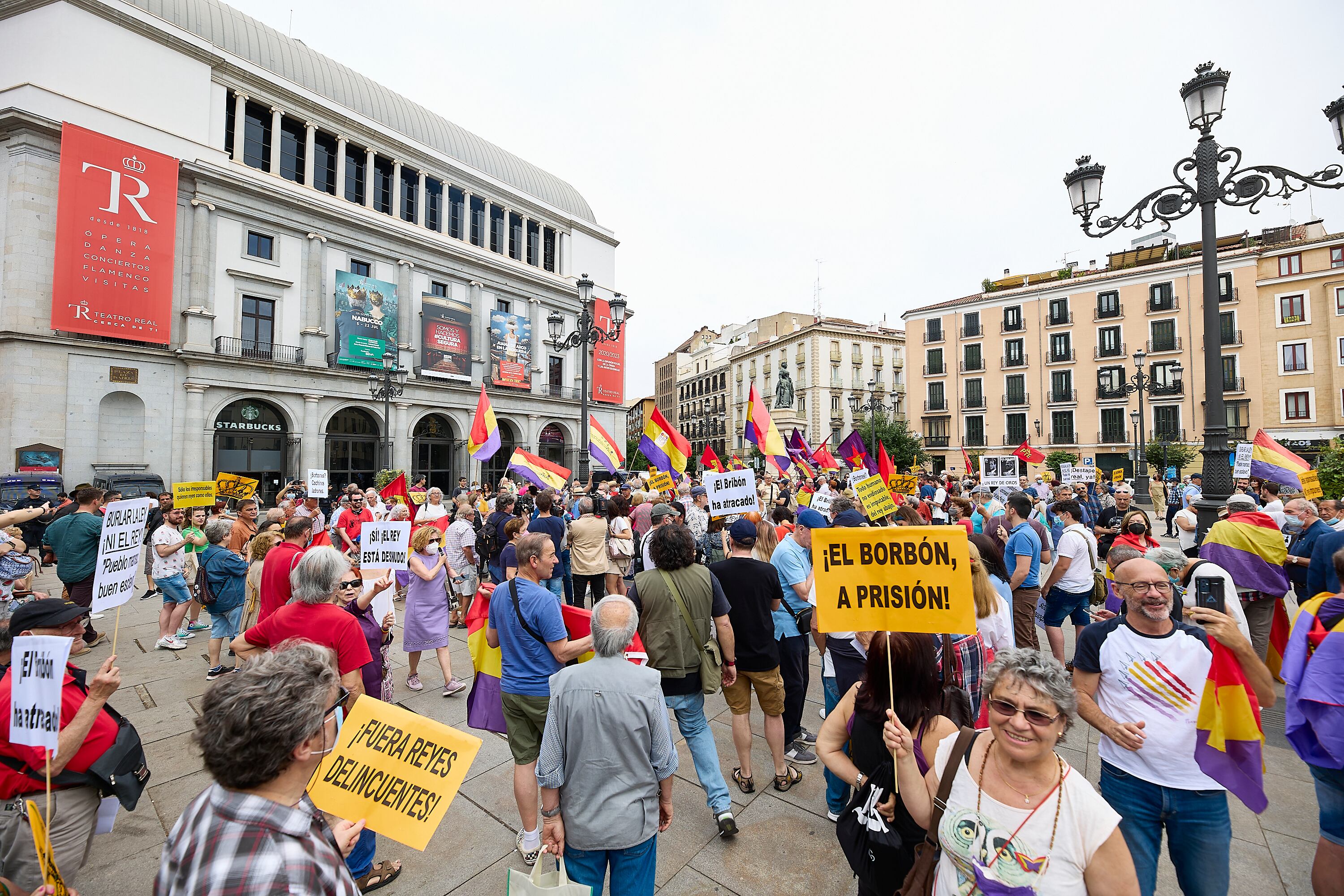 Varias personas se manifiestan con banderas de la República de España, durante una concentración contra la vuelta del Rey emérito a España, en la Plaza de Ópera, a 22 de mayo de 2022, en Madrid (España). Una treintena de organizaciones entre las qu Jesús Hellín - Europa Press (Jesus Hellin 2022/Europa Press)