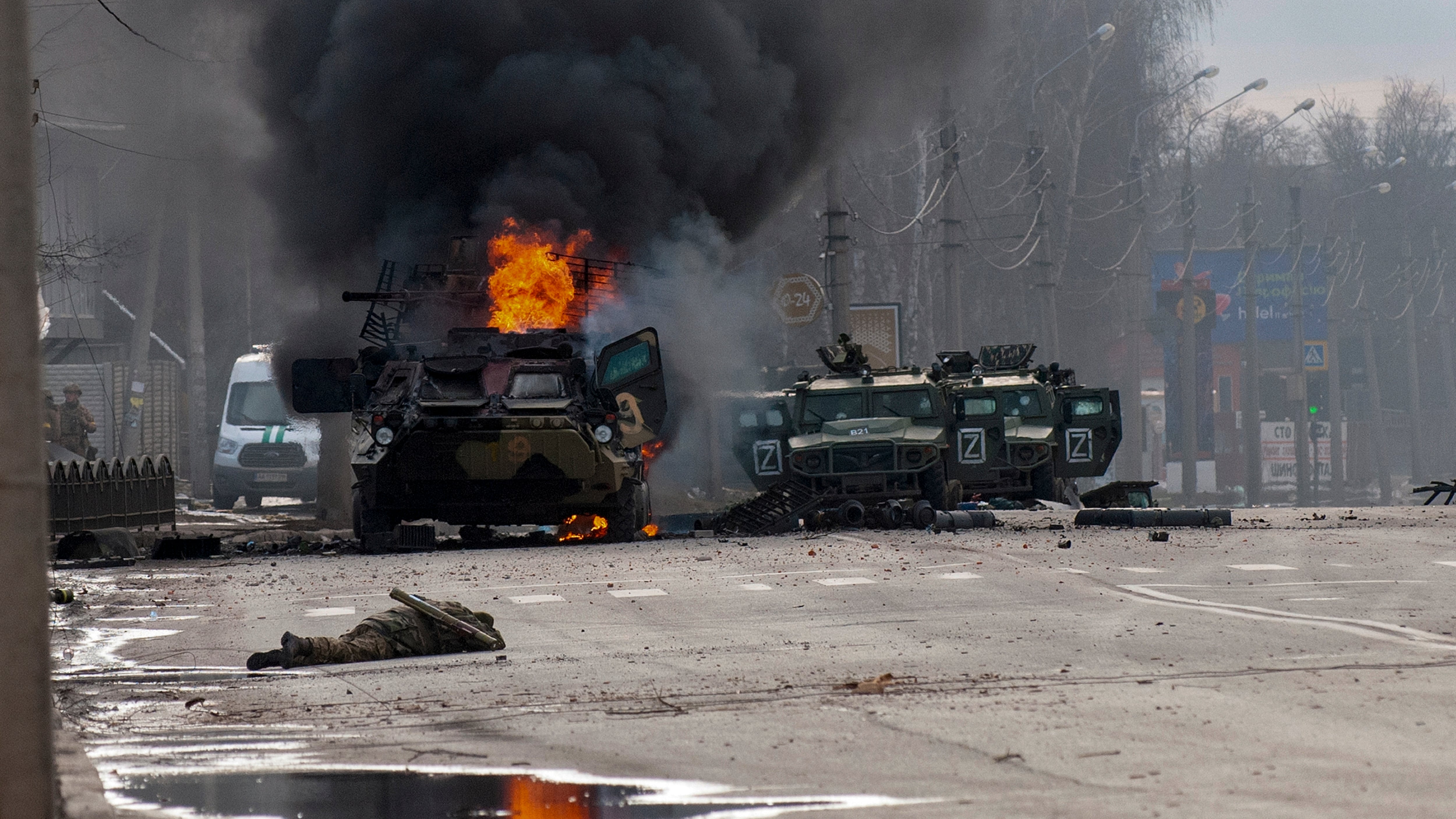 En lugar de eso, las tropas rusas se quedaron trabadas a las afueras de Kiev y otras grandes ciudades ante una firme defensa ucraniana. Convoyes de blindados rusos se veían paralizados en largos tramos de autopista. Las tropas se quedaban sin suministros ni gasolina y se convirtieron en objetivos fáciles desde aire y tierra.