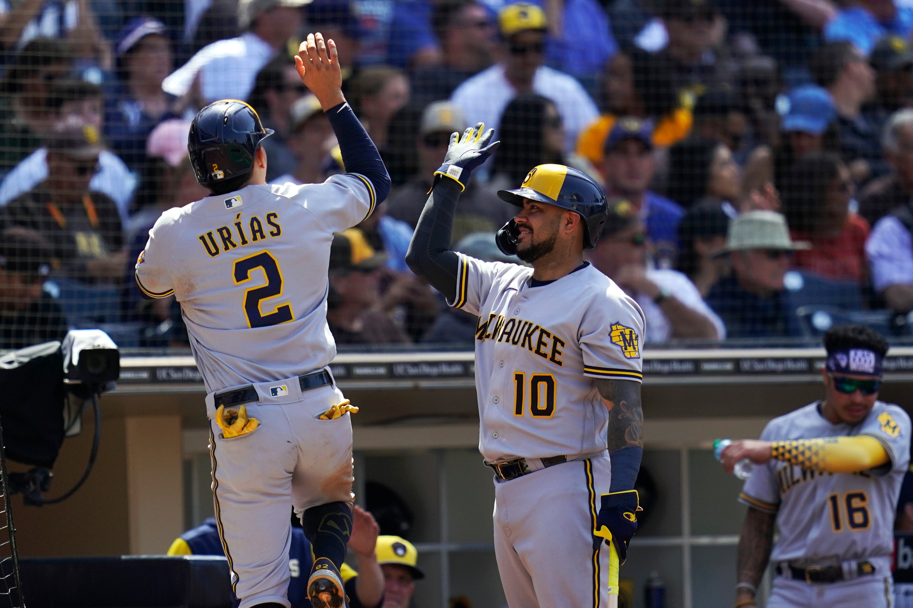 El exinfielder mexicano de los Padres Luis Urías consiguió una base por bolas al inicio de la entrada y alcanzó tercera con un sencillo de Andrew McCutchen, deslizándose de cabeza y tocando la base antes de que lo alcanzara Manny Machado.