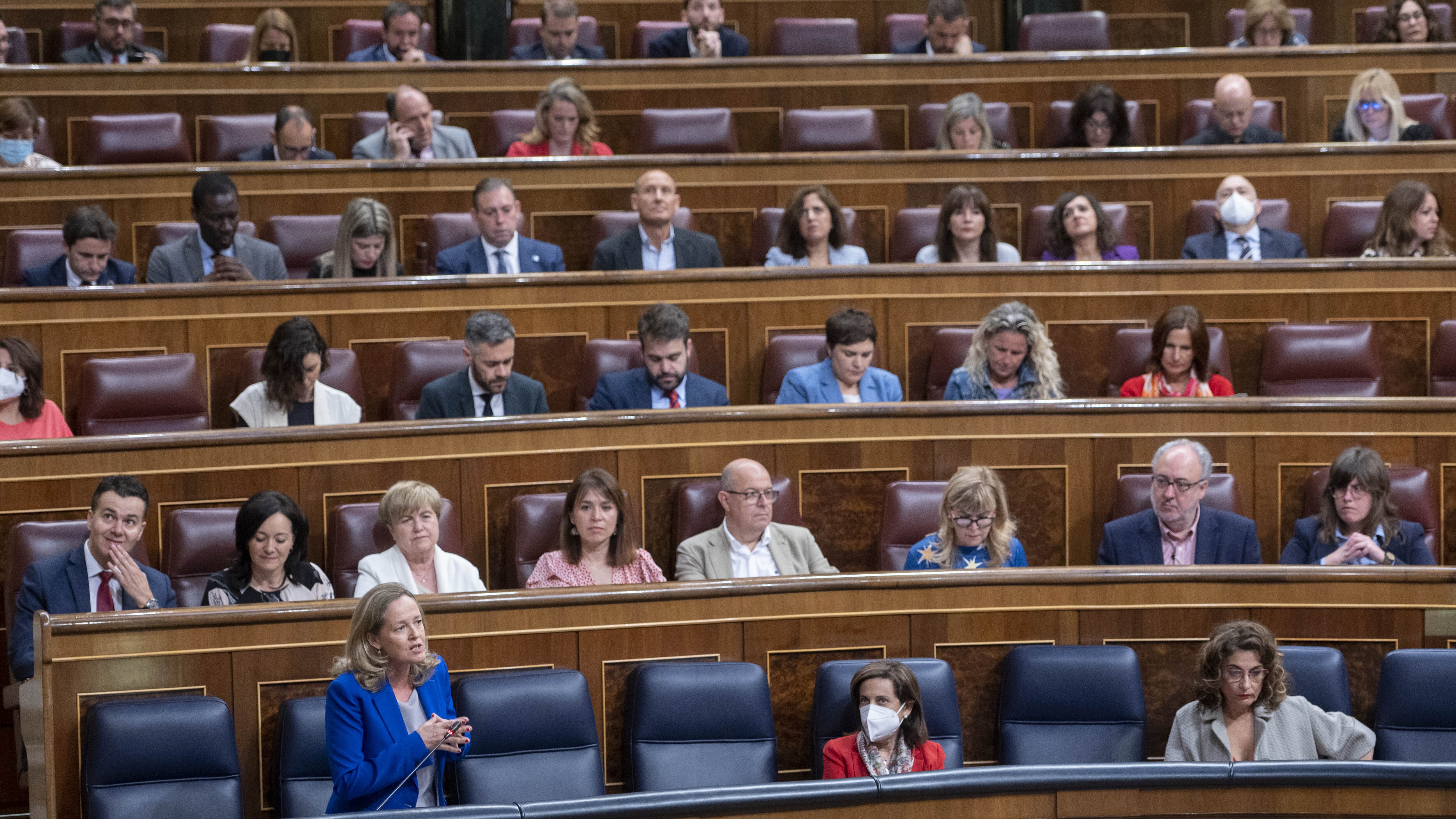 La vicepresidenta primera y ministra de Asuntos Económicos y Transformación Digital, Nadia Calviño, interviene en una sesión plenaria en el Congreso de los Diputados, a 25 de mayo de 2022, en Madrid (España). Durante el pleno, el Ejecutivo central de Alberto Ortega - Europa Press (Alberto Ortega - Europa Press/Europa Press)