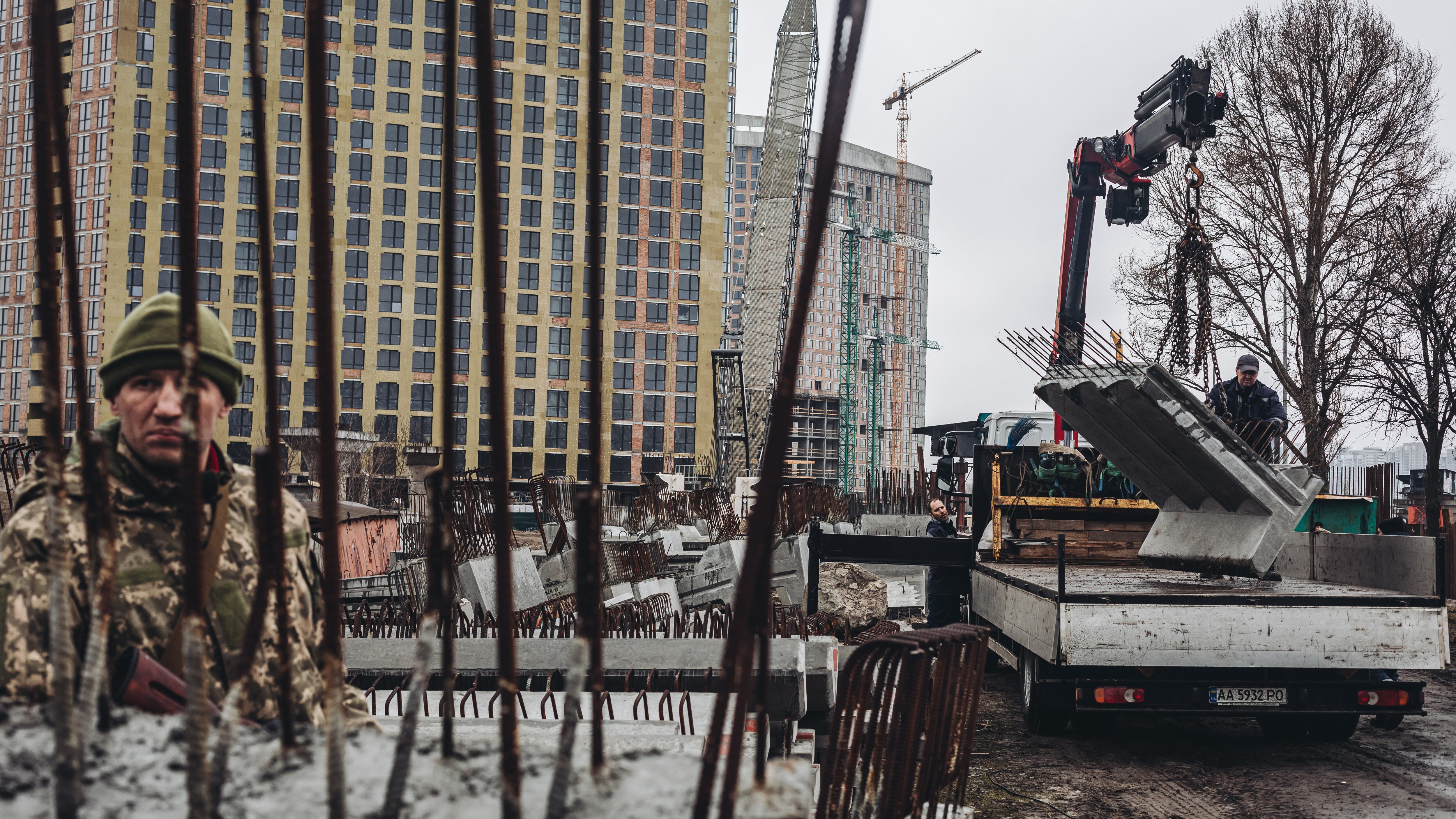 Archivo - Varios operarios cargan losas de cemento frente a un miliciano ucraniano, a 2 de marzo de 2022, en Kiev (Ucrania). Las autoridades de Kiev han declarado el toque de queda en la ciudad ante la situación causada por la ofensiva rusa en el país. Diego Herrera - Europa Press - Archivo (Diego Herrera Carcedo/Europa Press)