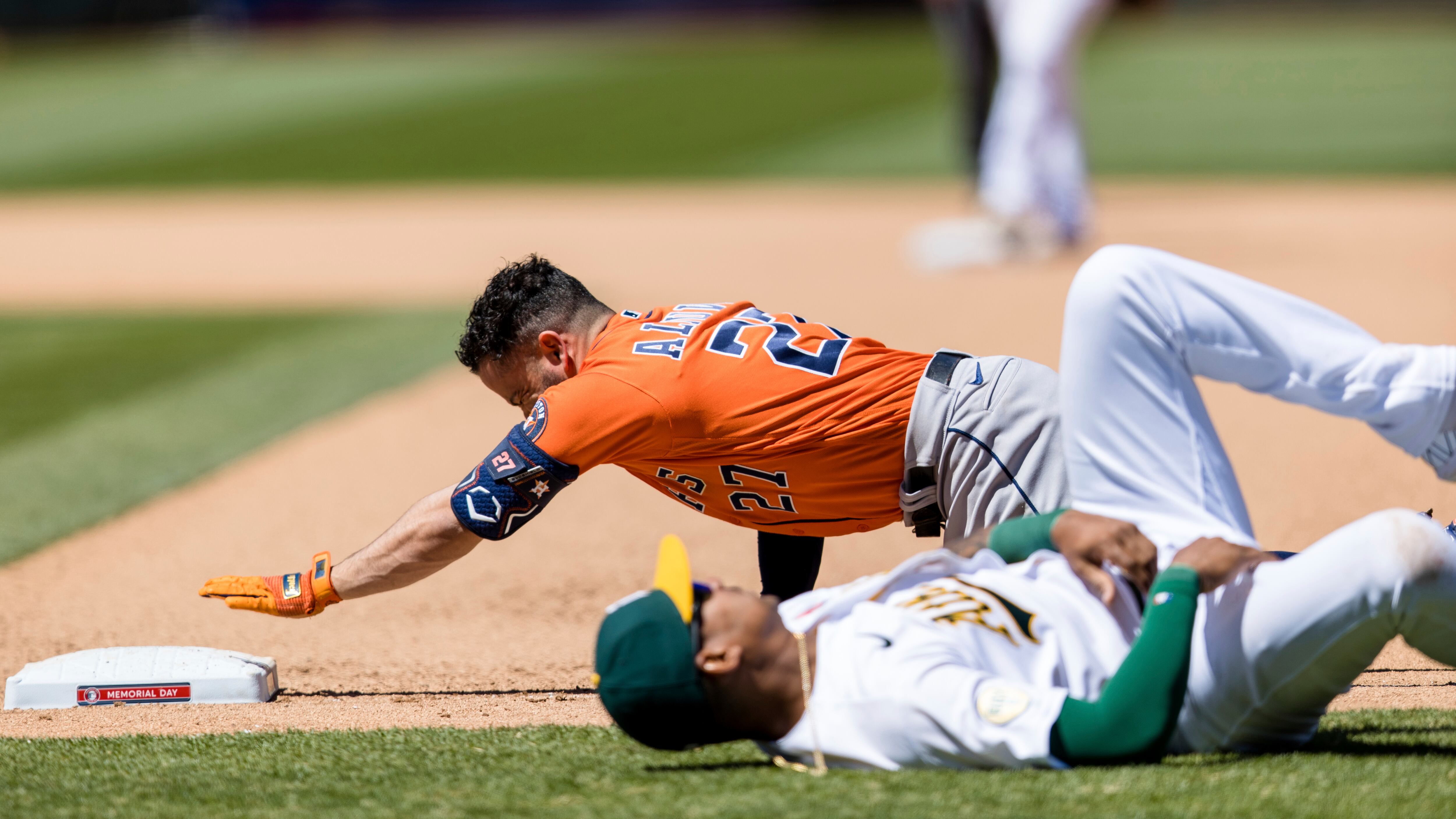 El venezolano José Altuve, de los Astros de Houston, al centro arriba, regresa a la inicial tras colisionar con el primera base panameño Christian Bethancourt, de los Atléticos de Oakland, de espaldas al suelo, en la séptima entrada del partido en Oak AP (John Hefti/AP)