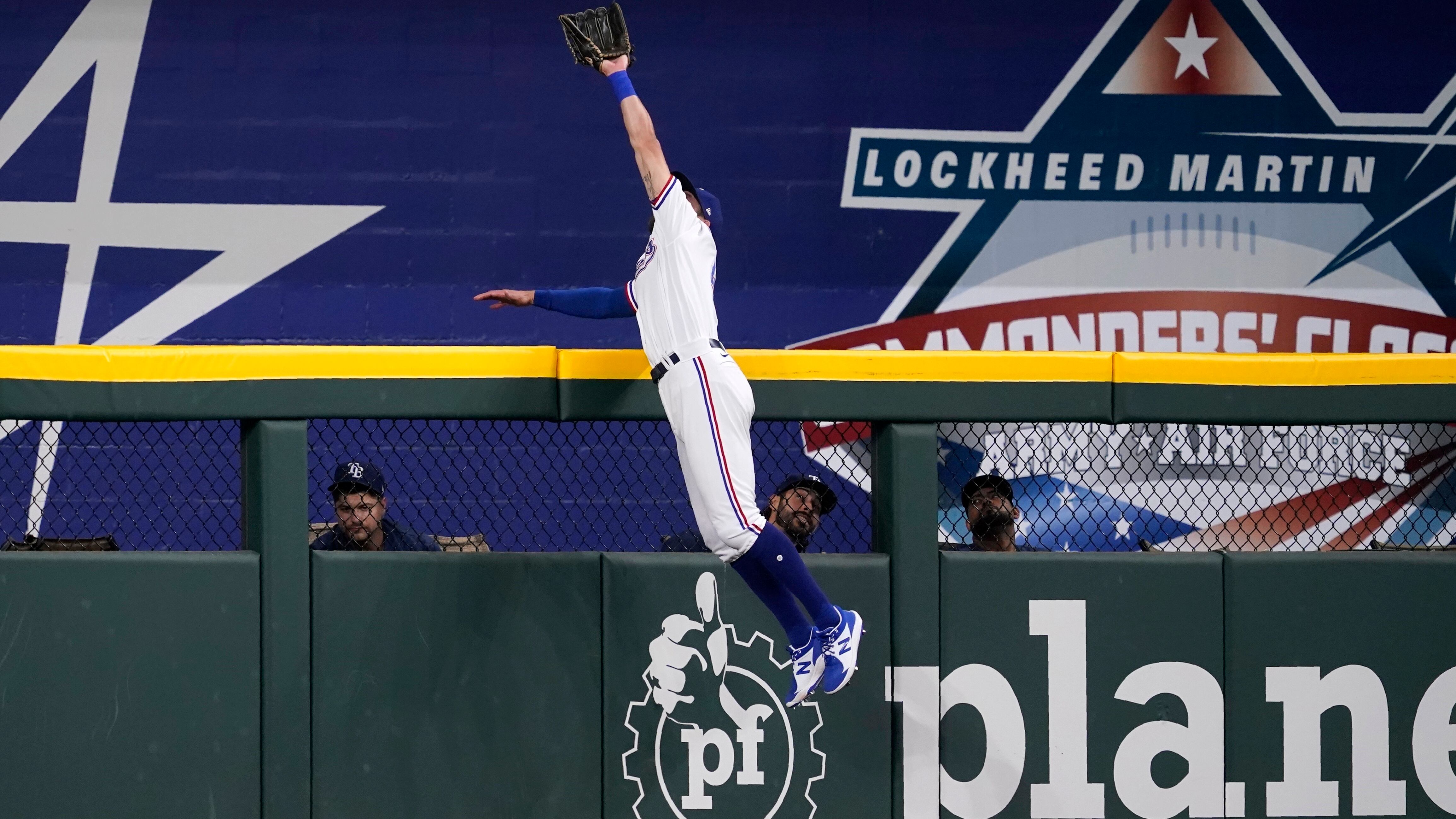 ARLINGTON, Texas (AP) — El jardinero central de los Rangers Eli White realizó una espectacular atrapada sobre el muro para impedir un jonrón de tres carreras de Ji-Man Choi en el primer inning y sacudió un vuelacercas, y Texas derrotó el lunes 9-5 a los Rays de Tampa Bay.