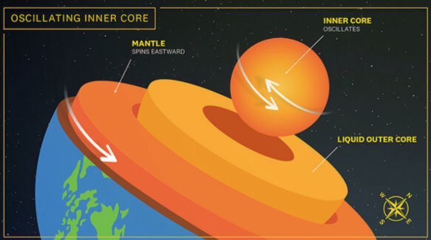 Un estudio publicado en Science Advances por investigadores de la USC (University of Southern California) muestra que el núcleo interno cambió de dirección en el período de seis años comprendido entre 1969 y 1974, según el análisis de los datos sísmicos. Los científicos afirman que su modelo de movimiento del núcleo interno también explica la variación de la duración del día, que ha demostrado oscilar de forma persistente durante las últimas décadas.
