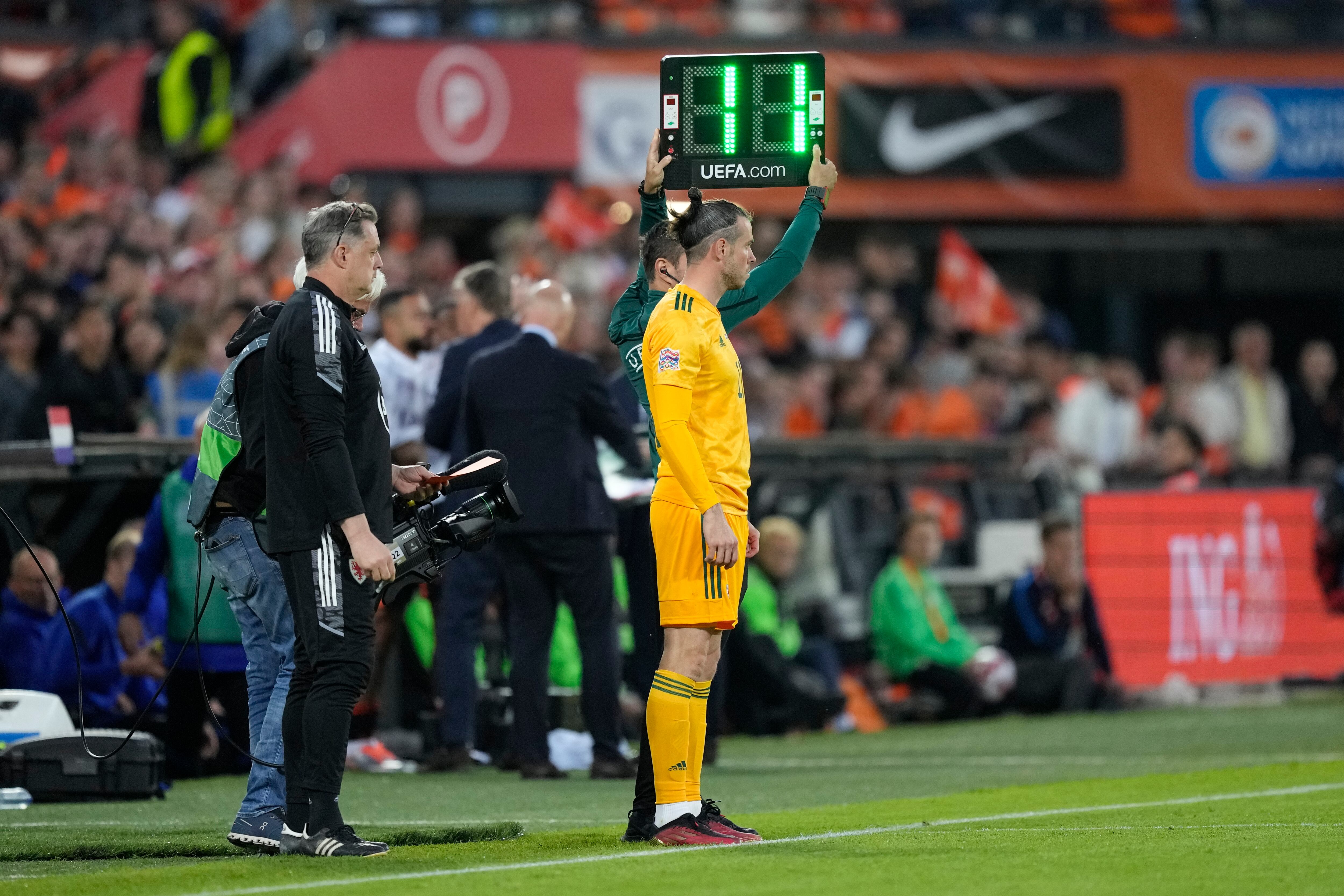 Gareth Bale, de Gales, espera para ingresar a la cancha de cambio durante un encuentro ante Holanda, el martes 14 de junio de 2022 (AP Foto/Peter Dejong) AP (Peter Dejong/AP)