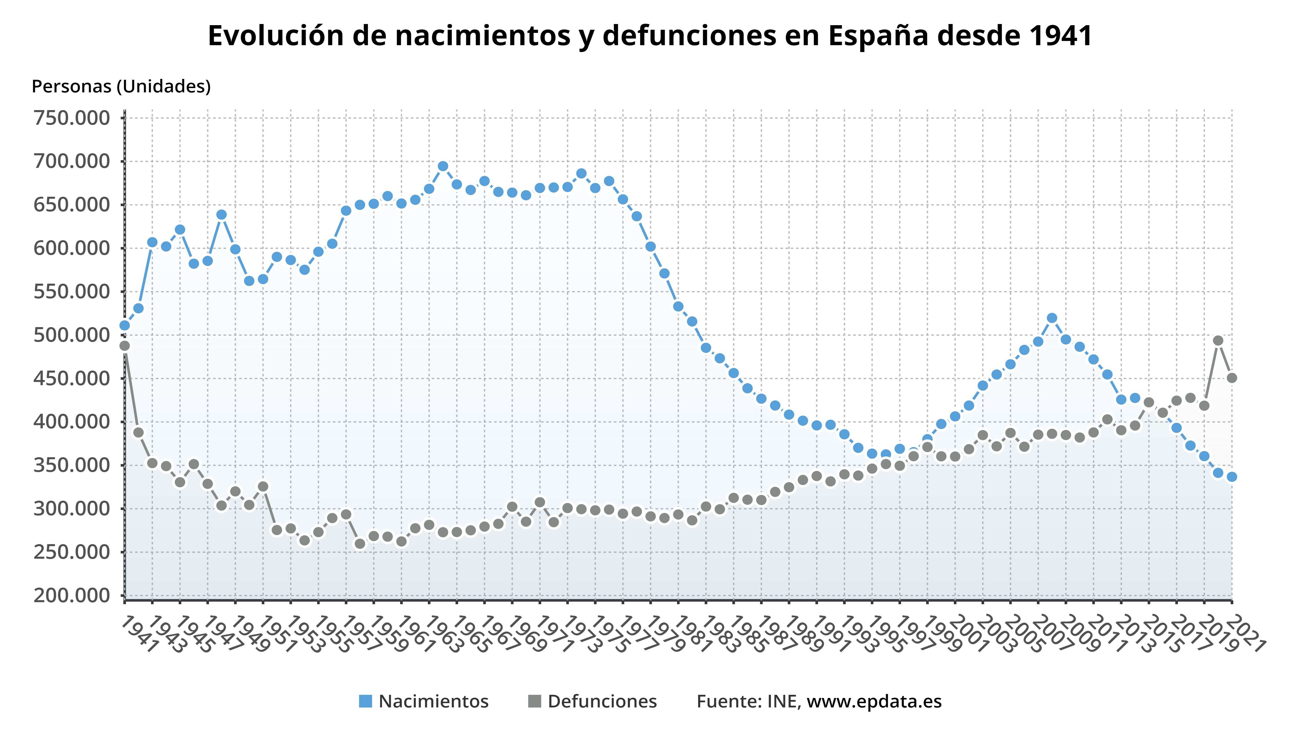 De este modo, el año pasado volvió a haber más muertes que nacimientos en España, lo que supone un saldo vegetativo negativo de 113.023. Tal y como señala el informe, esta diferencia entre nacimientos y defunciones es la segunda más negativa desde que existen datos, en 1941, es decir, hace 80 años. Sólo la supera las 151.812 personas de 2020.