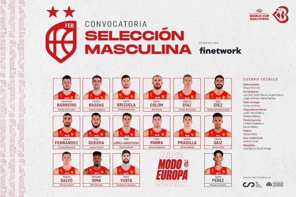 Así, la convocatoria la conforman Jonathan Barreiro (Unicaja), Ferran Bassas (Joventut Badalona), Darío Brizuela (Unicaja), Quino Colom (AEK Atenas), Alberto Díaz (Unicaja), Dani Díez (Hereda San Pablo Burgos), Jaime Fernández (Unicaja), Fran Guerra (Lenovo Tenerife), Xabi López Arostegui (Valencia Basket), Joel Parra (Joventut Badalona), Jaime, Pradilla (Valencia Basket), Miquel Salvó (CB Gran Canaria), Sebas Saiz (Almark Tokyo), Yankuba Sima (Baxi Manresa) y Santi Yusta (Casademont Zaragoza). Además, también participará en la concentración, en condición de invitado, Tyson Pérez (Morabank Andorra).