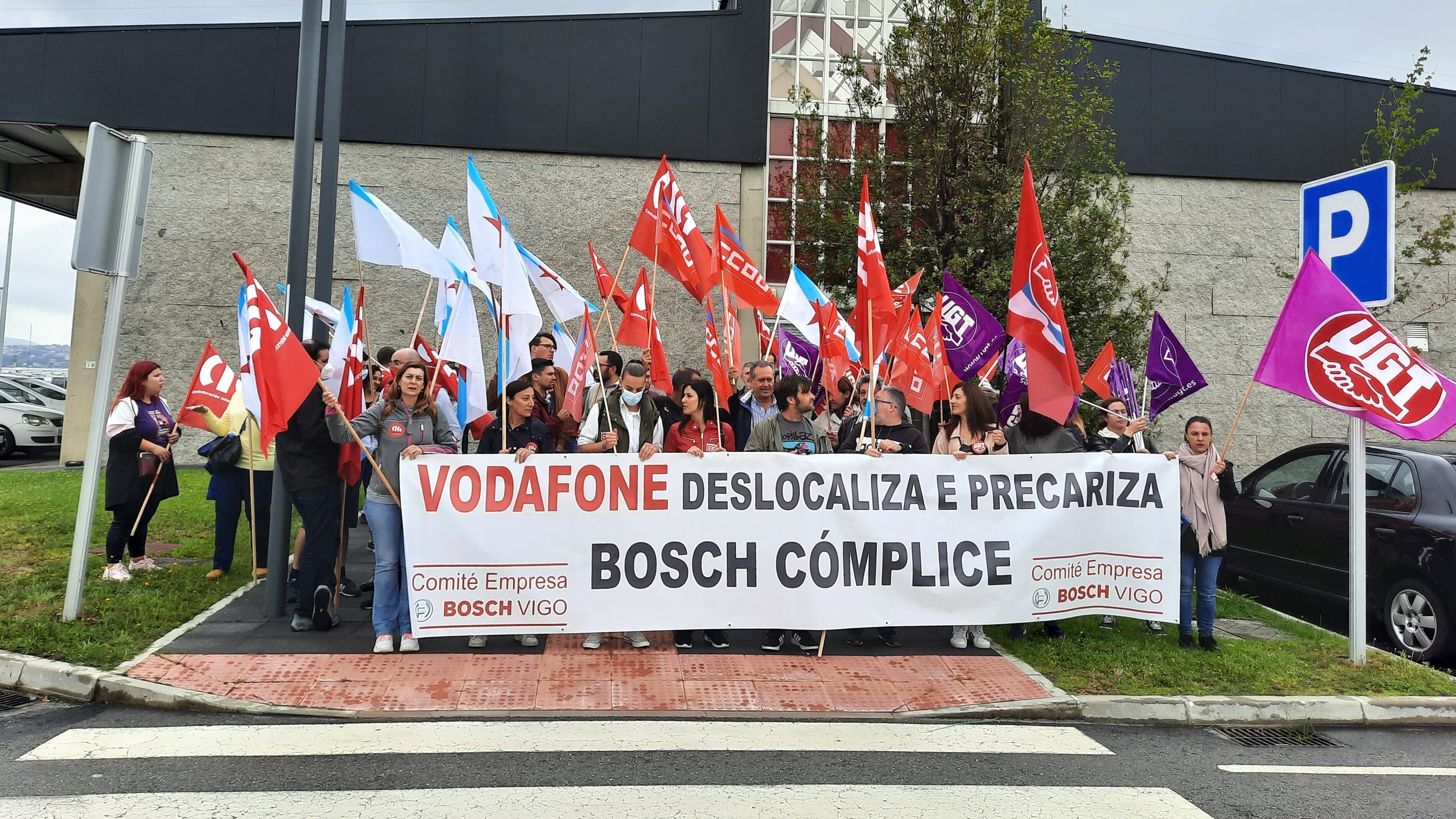 A gritos de 'Non, non, non a deslocalización' (No, no, no a la deslocalización), 'Traballo digno na nosa terra' (Trabajo digno en nuestra tierra) o 'Queremos traballar, non emigrar' (Queremos trabajar, no emigrar), decenas de trabajadores de Bosch han protestado delante de las oficinas de Vodafone en Vigo para pedir un cambio de posición de la empresa.