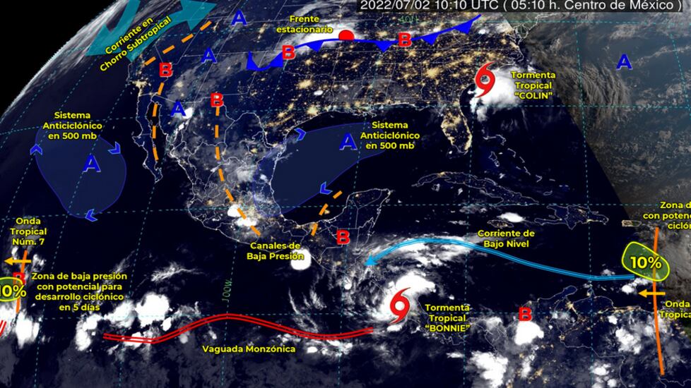 La madrugada de este sábado 2 de julio, la Comisión Nacional del Agua (Conagua) dio a conocer que monitorea las tormentas tropicales de ‘Bonnie’ y ‘Colin’, dos fenómenos climáticos que hasta el momento se encuentran alejados de territorio mexicanos, sin embargo, en los próximos días podrían acercarse al país.