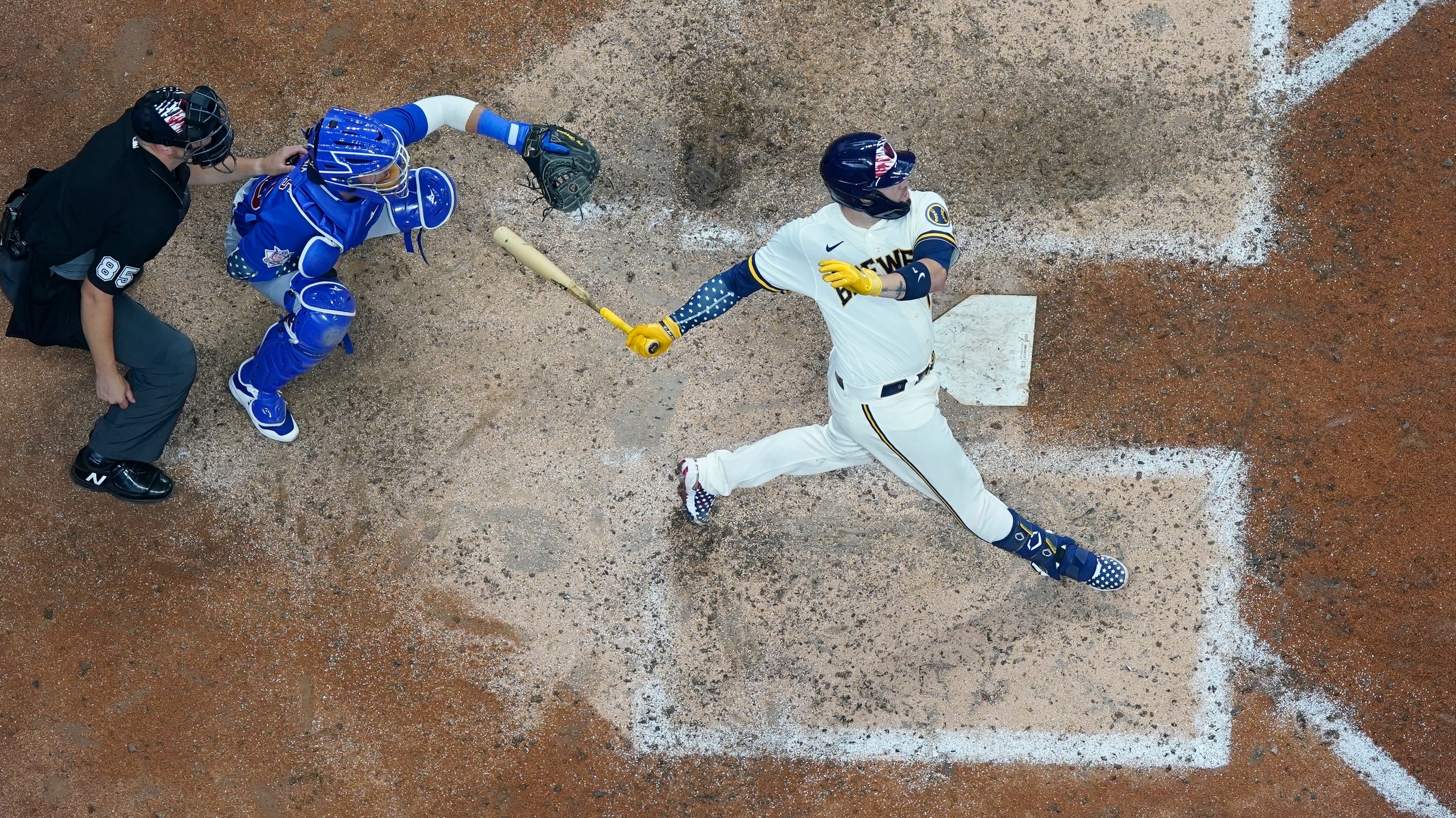 El puertorriqueño Víctor Caratini, de los Cerveceros de Milwaukee, dispara un jonrón de tres carreras para ganar el partido en la 10ma entrada ante los Cachorros de Chicago, el lunes 4 de julio de 2022, en Milwaukee. (AP Foto/Morry Gash) AP (Morry Gash/AP)
