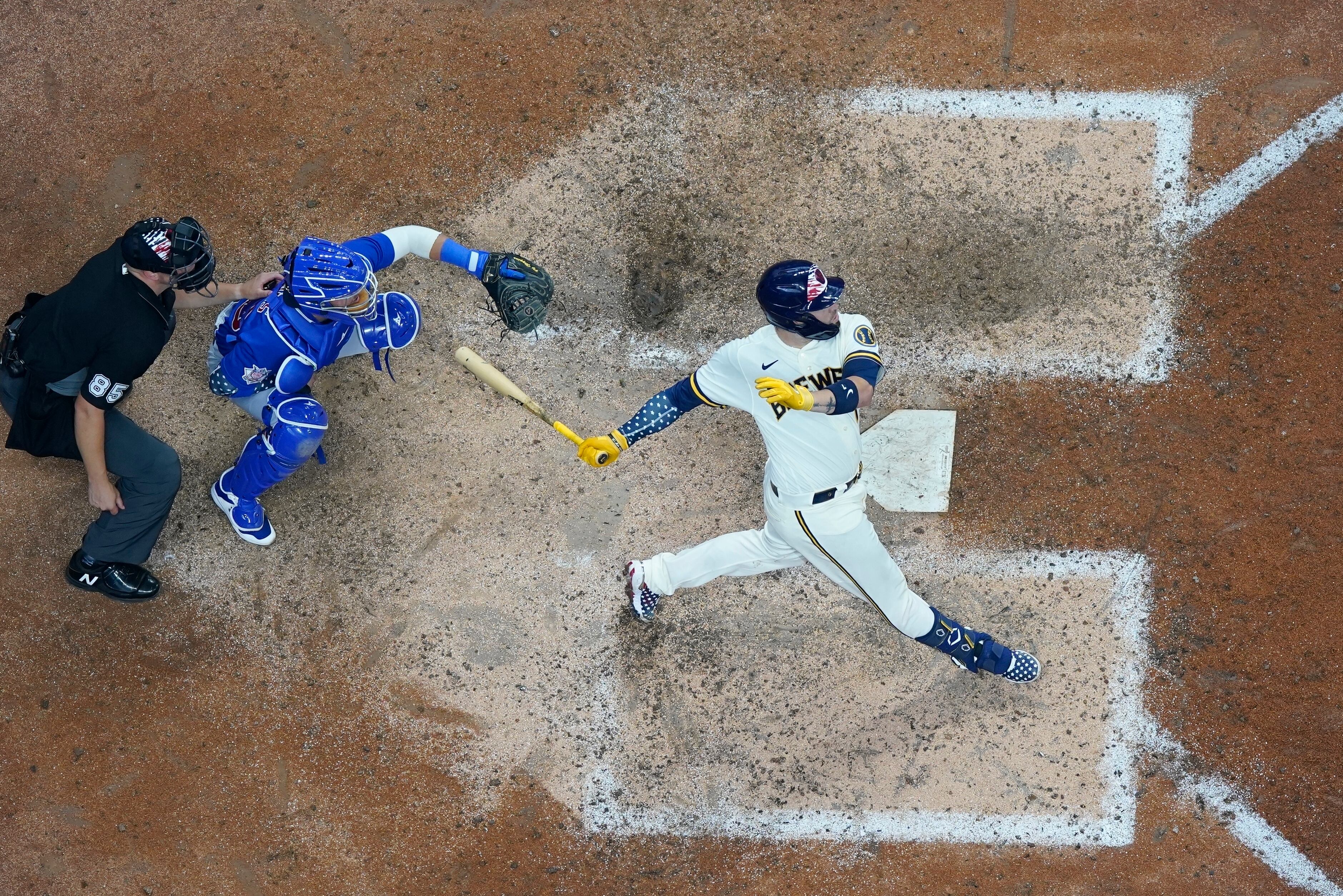 El puertorriqueño Víctor Caratini, de los Cerveceros de Milwaukee, dispara un jonrón de tres carreras para ganar el partido en la 10ma entrada ante los Cachorros de Chicago, el lunes 4 de julio de 2022, en Milwaukee. (AP Foto/Morry Gash) AP (Morry Gash/AP)