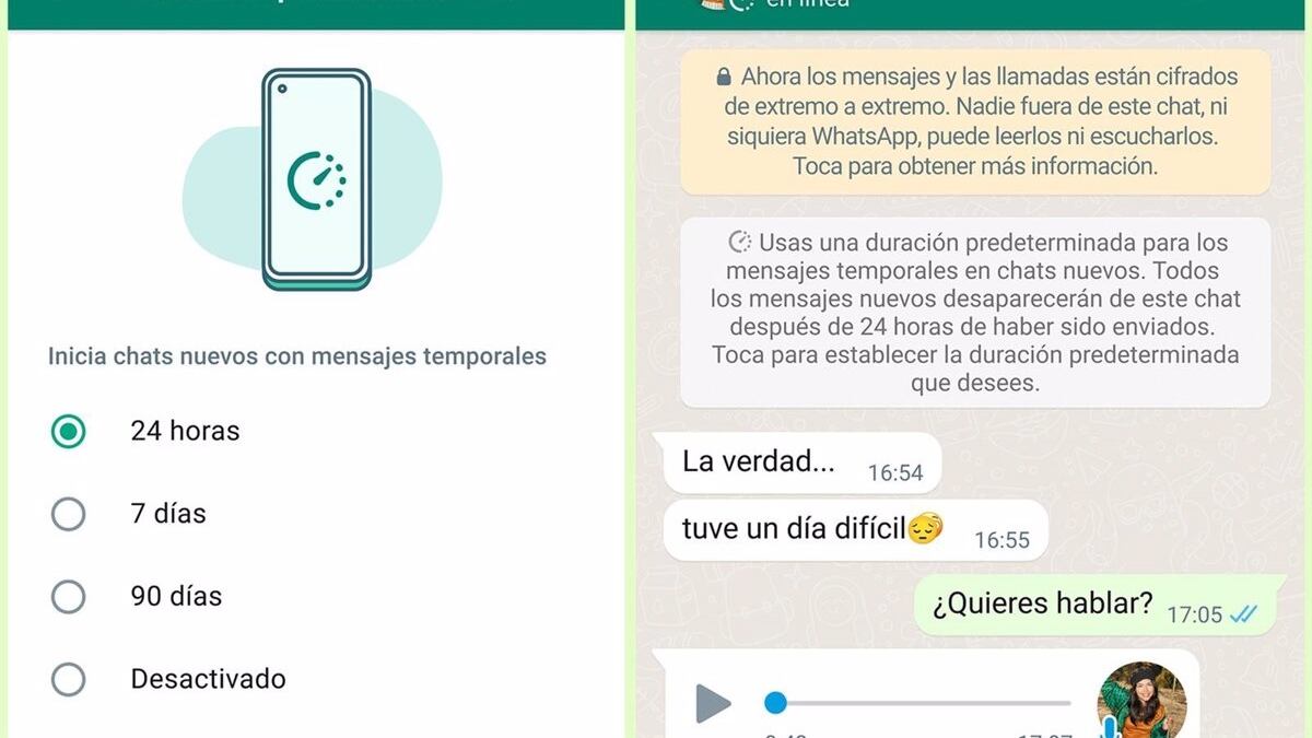 Entre ellas, destacaba una función que permitía a los usuarios establecer chats completos con esta configuración y con límites de tiempo diferentes, ya que se presentaron dos nuevas duraciones: 24 horas y 90 días.