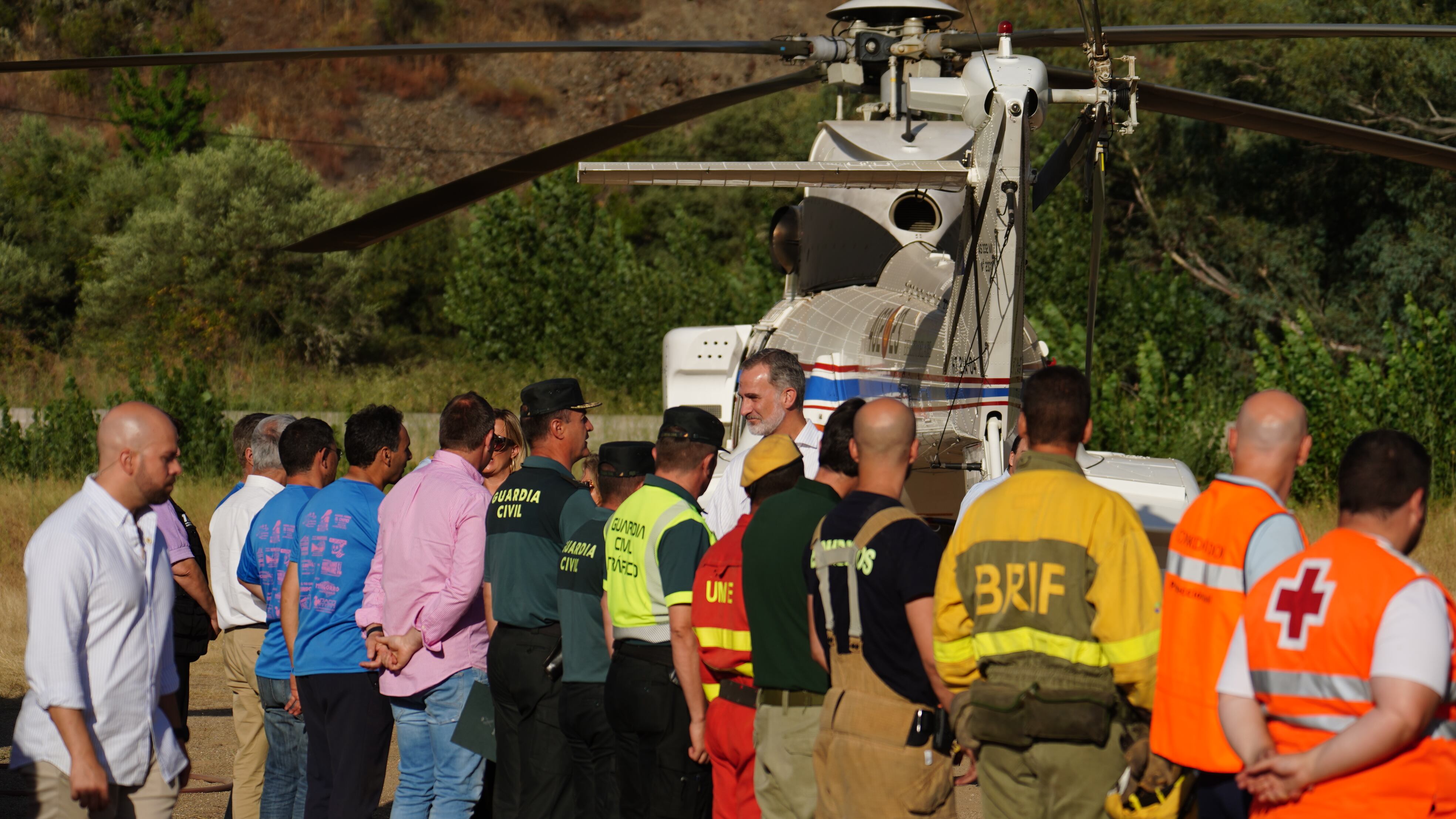 Durante su visita, Don Felipe ha saludado personalmente a diversos efectivos de lucha contra el fuego y emergencias que han trabajando en los últimos días en este incendio, como miembros del Plan Infoex, de Guardia Civil, Cruz Roja, o Unidad Militar de Emergencias, entre otros.