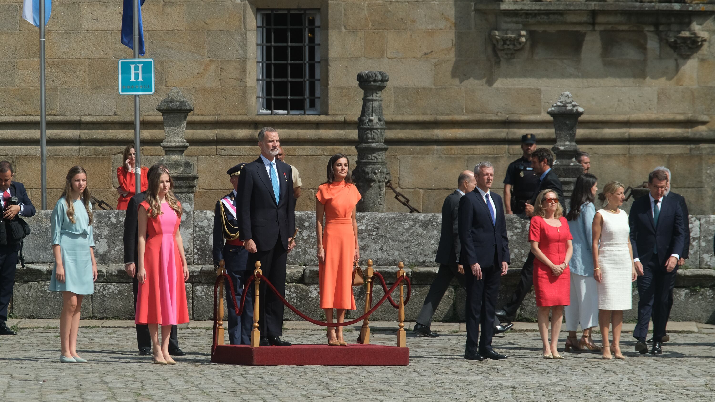 Felipe VI fue el encargado del tradicional pase de revista a las tropas y, posteriormente, las autoridades presentes realizaron el saludo a la Familia Real. Entre las personalidades figuraban el presidente de la Xunta, Alfonso Rueda; las vicepresidentas primera y segunda del Gobierno, Nadia Calviño y Yolanda Díaz; el titular del Parlamento de Galicia, Miguel Ángel Santalices; el alcalde de la capital gallega, Xosé Sánchez Bugallo; el Gobierno gallego en pleno y el presidente del PP y líder de la oposición, Alberto Núñez Feijóo, además de otras autoridades civiles y militares.