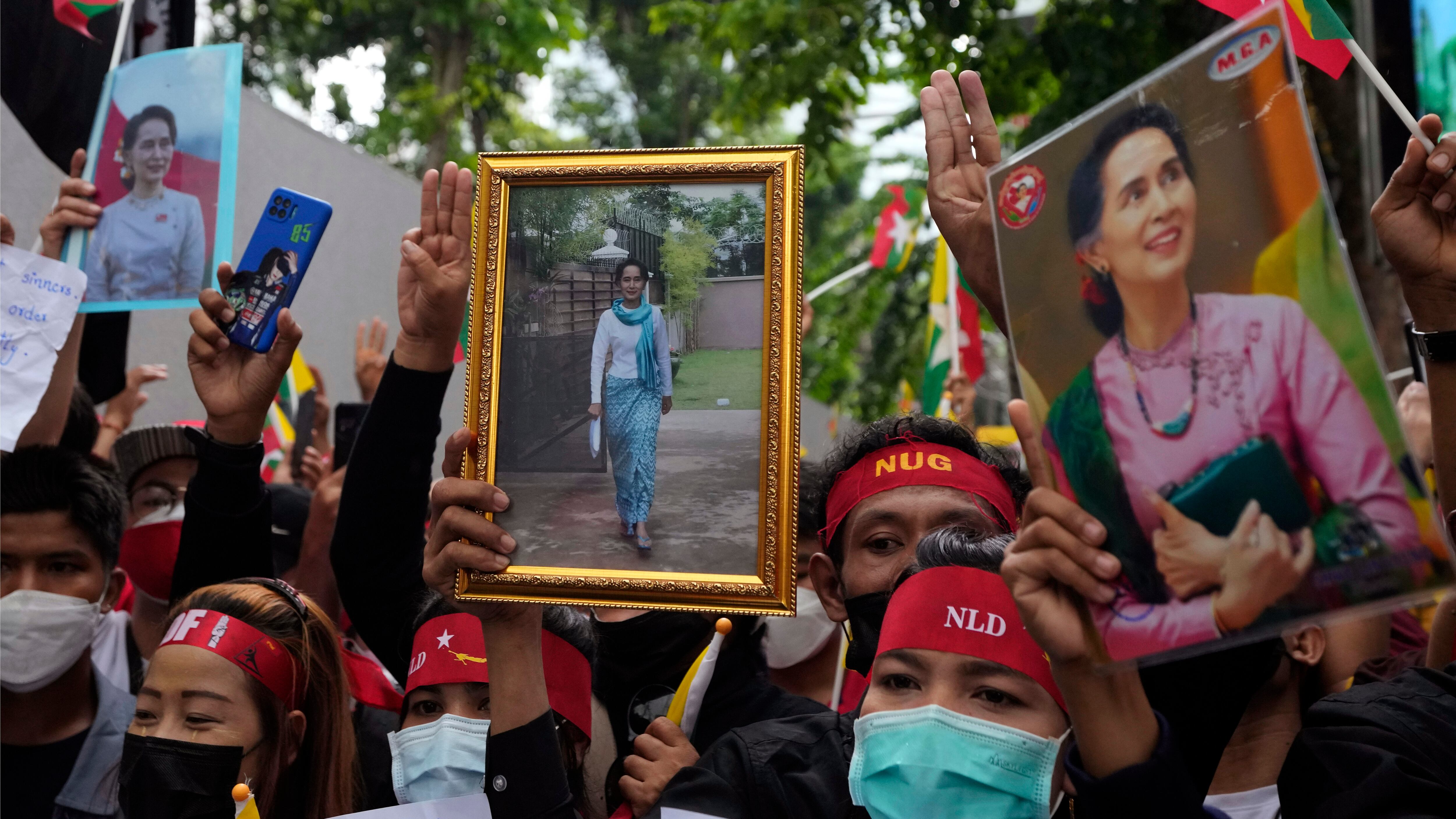 “¡Los dictadores usaron su poder de manera arbitraria!” gritó un manifestante entre la multitud, en medio de retratos de Suu Kyi y de los cuatro hombres ejecutados.