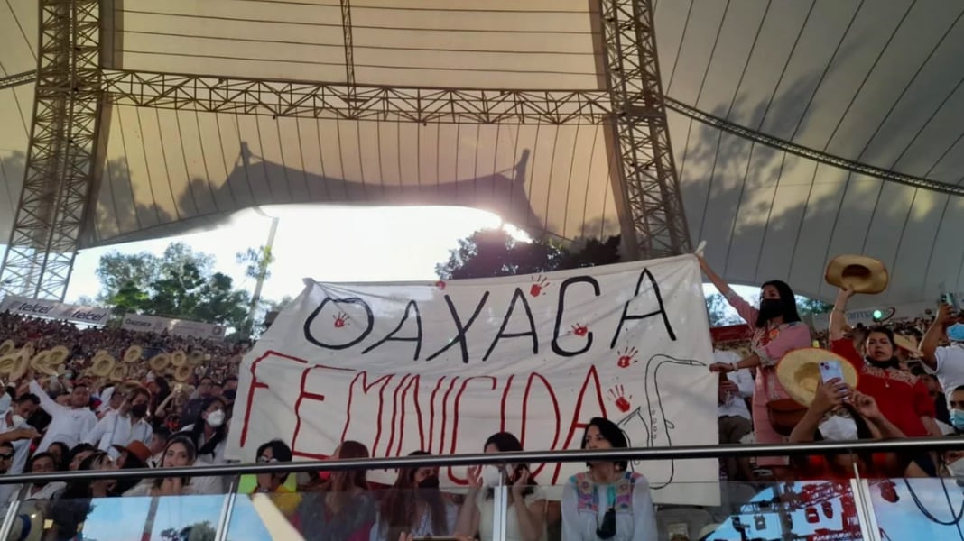 La saxofonista oaxaqueña María Elena Ríos fue sacada por policías de la función vespertina de la Guelaguetza, en su primer Lunes del Cerro en el Auditorio Guelaguetza, luego de que mostró desde las gradas una manta con la leyenda “Oaxaca Feminicida”, por las 78 mujeres que han sido asesinados en la entidad durante 2022.