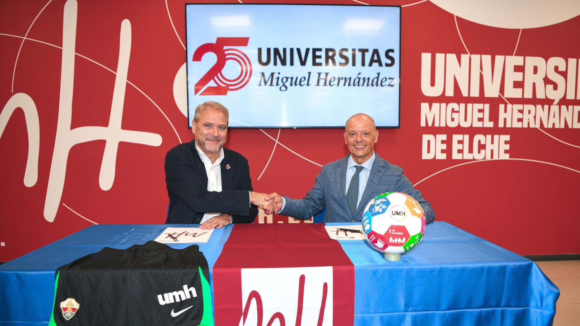 Así lo acordaron el presidente del Elche CF, Joaquín Buitrago, y el rector de la Universidad Miguel Hernández (UMH) de Elche, Juan José Ruiz, en un acto celebrado en el Aula Plaça de Baix de la UMH, junto al Ayuntamiento de la localidad ilicitana.