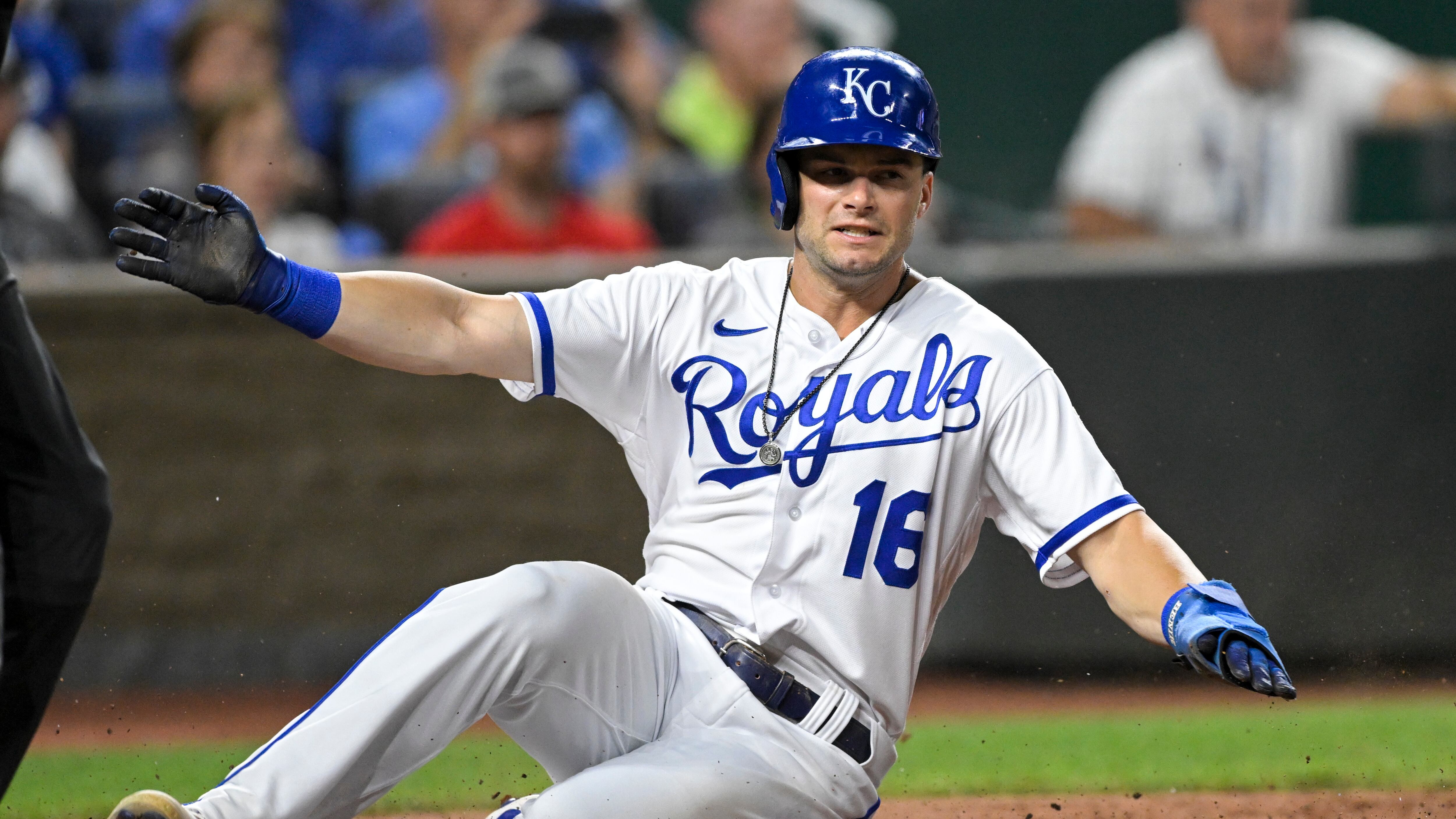 Andrew Benintendi Andrew Benintendi, de los Reales de Kansas City, se barre y anota en la octava entrada del partido contar los Tigres de Detroit, en Kansas City, Missouri, el martes 12 de julio de 2022. (AP Foto/Reed Hoffmann) (Reed Hoffmann/AP)