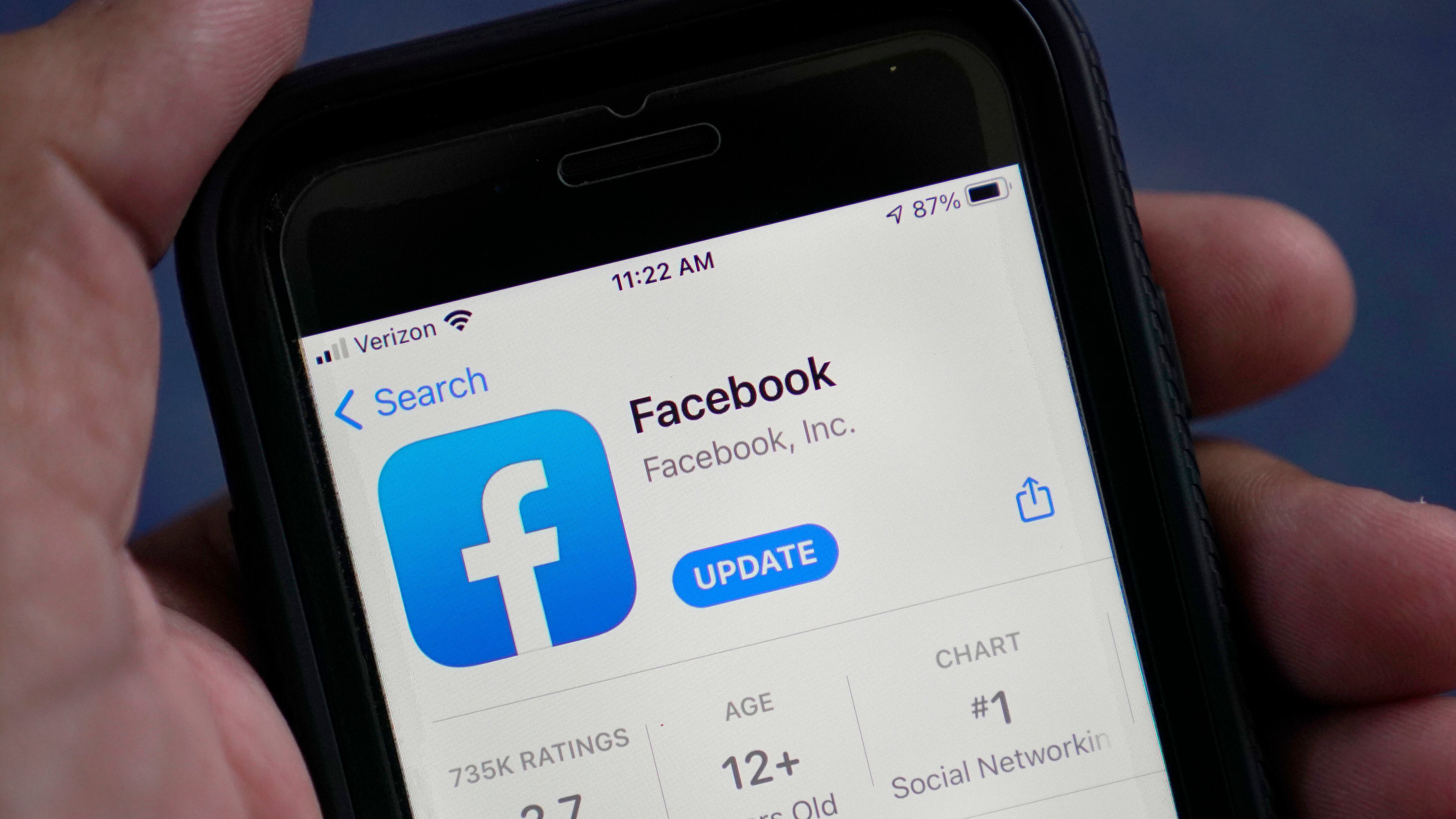 ARCHIVO - La aplicación de Facebook se muestra en la tienda de aplicaciones de un teléfono inteligente en Surfside, Florida, el 23 de abril de 2021. (AP Foto/Wilfredo Lee, Archivo) AP (Wilfredo Lee/AP)
