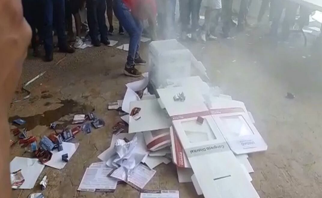 Militantes del Movimiento Regeneración Nacional (Morena) quemaron las urnas y boletas durante la jornada de votación para elegir consejeros, en el municipio de Huehuetán.