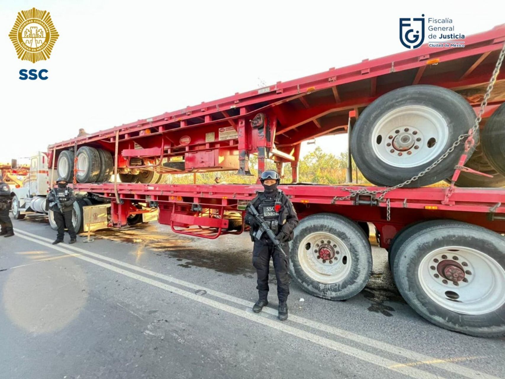 “Elementos de la Secretaría de Seguridad Ciudadana (SSC) detuvieron a los hombres después de asegurar poco más de una tonelada 600 kilogramos de droga, conocida como cocaína, transportada en dos tractocamiones con cuatro plataformas y un vehículo que probablemente los escoltaba”, explicó la FGJ.